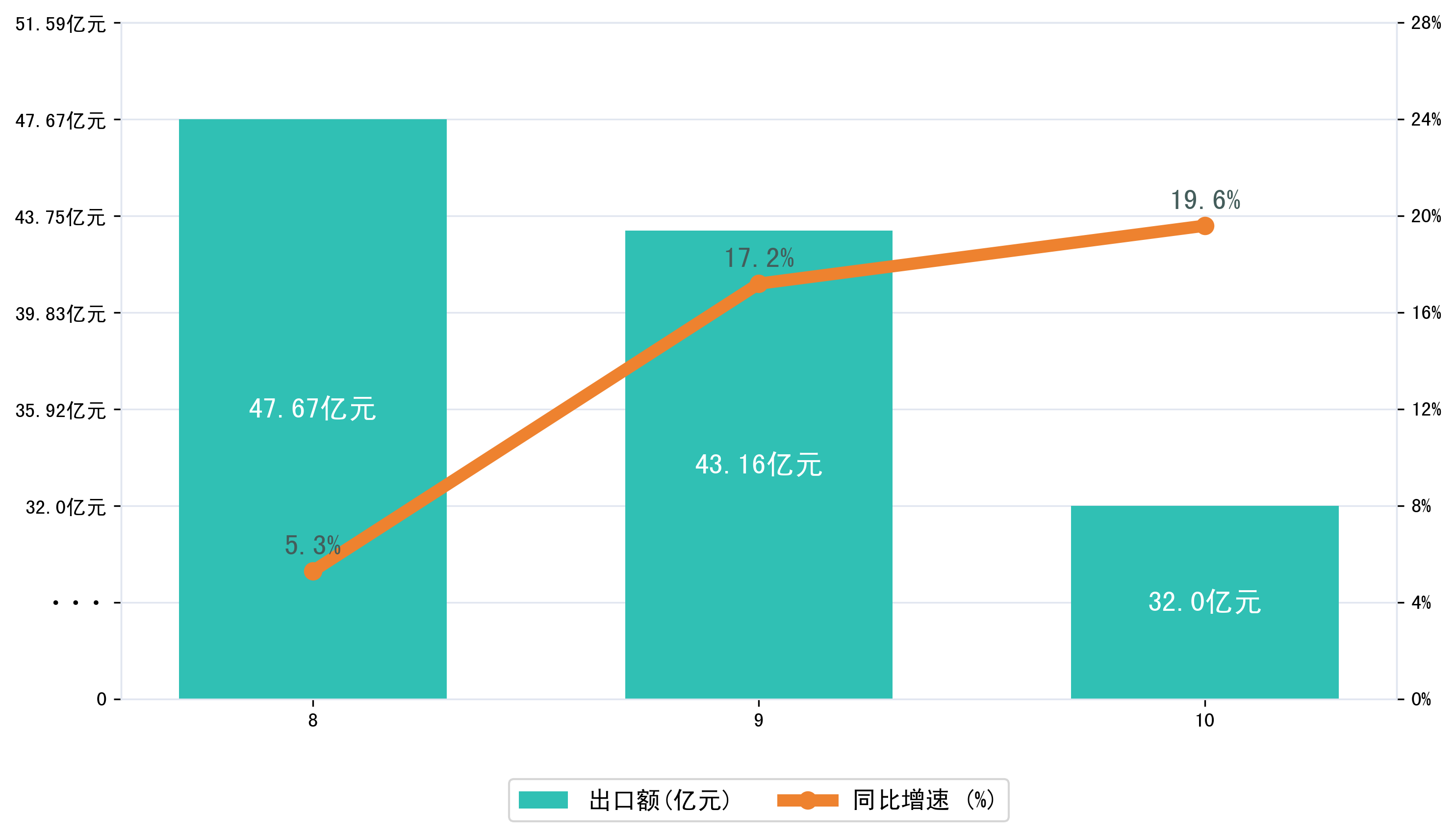 以人民币计,2025年10月廊坊市出口额为31,9992.7855万元,相比上月减少了11,1623.6662万元;相比上年同期增加了9,2199.8998万元,同比增加了19.60%。