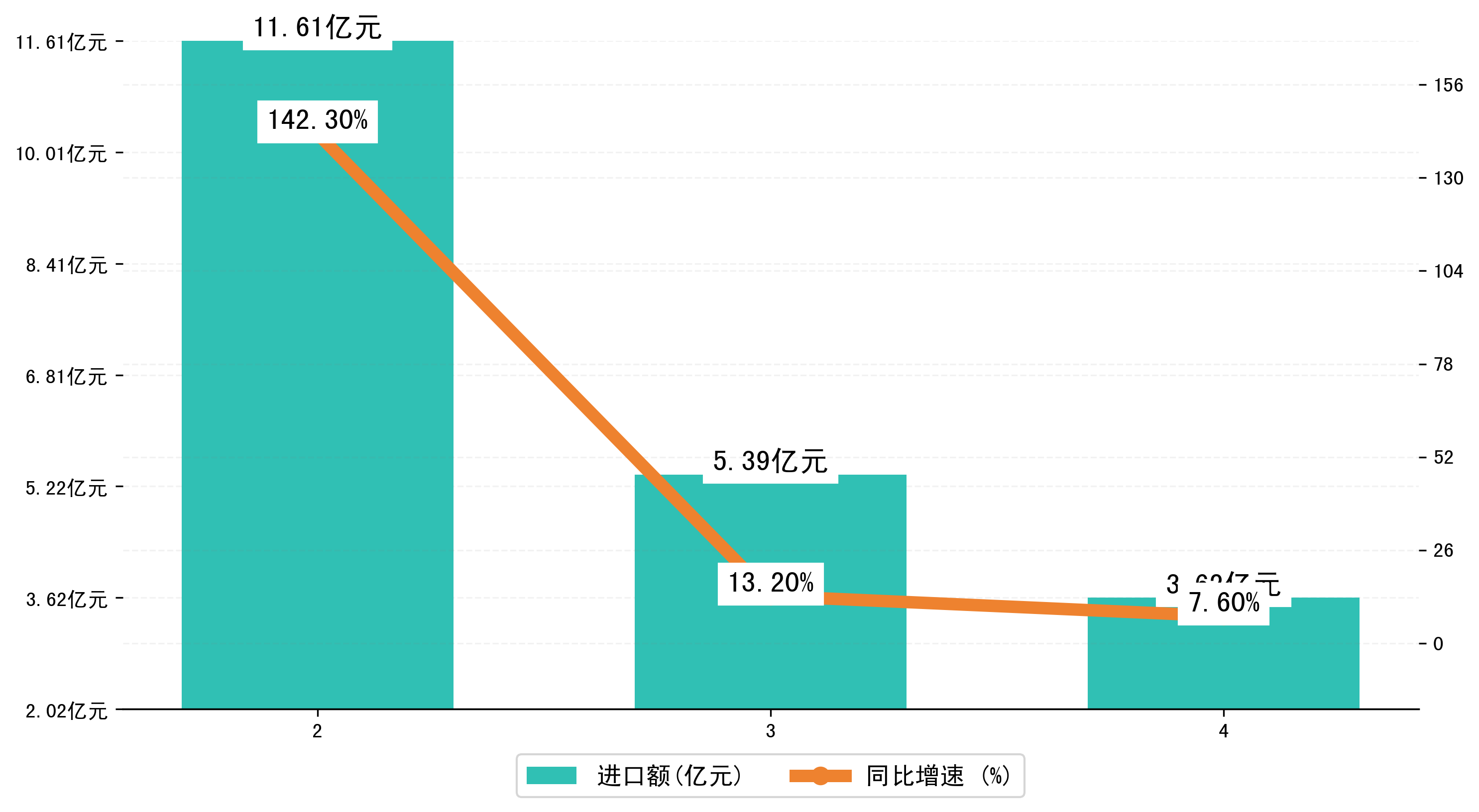 以人民币计,2024年4月兰州市进口额为3,6193.3558万元,相比上月减少了1,7686.3023万元;相比上年同期减少了2,9574.9881万元,同比增加了7.60%。