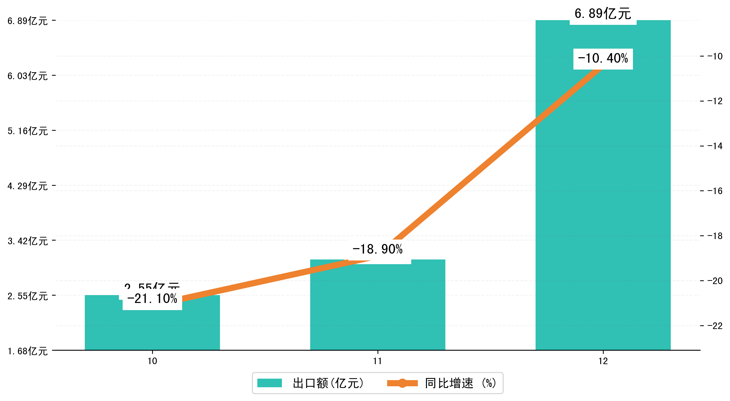 以人民币计,2024年1-12月兰州市出口额为42,3321.3103万元,相比上年同期减少了4,9294.1324万元,同比减少了-10.40%。