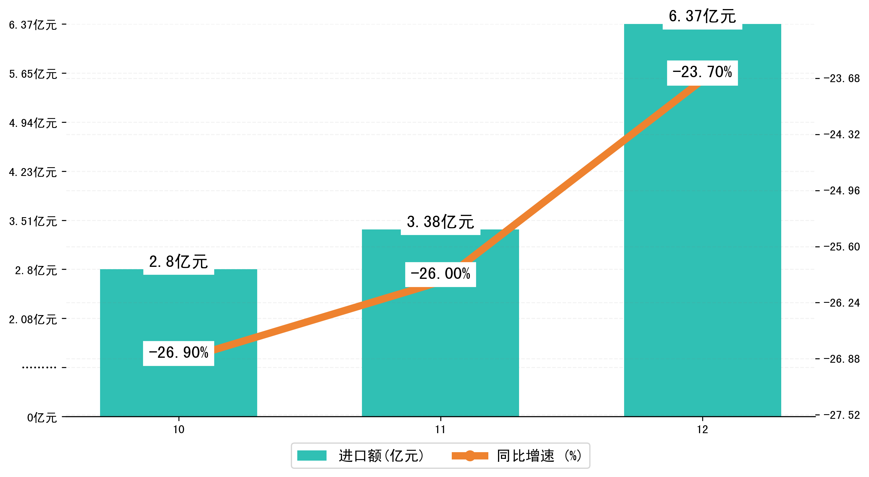 以人民币计,2024年12月兰州市进口额为6,3691.9704万元,相比上月增加了2,9916.4315万元;相比上年同期减少了655.9841万元,同比减少了-23.70%。