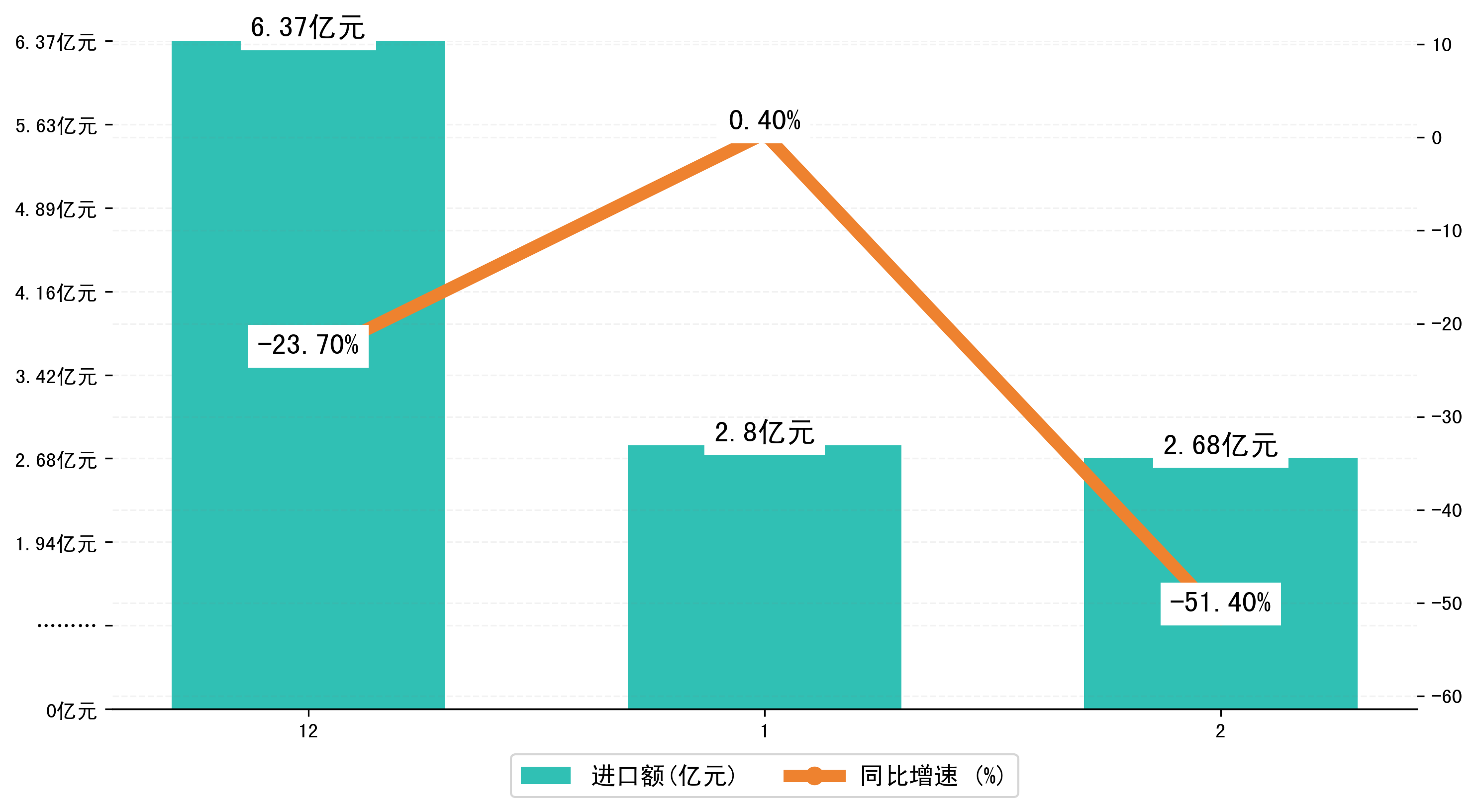 以美元计,2025年1-2月兰州市进口额为7616.3111万美元,相比上年同期减少了1,2660.3965万美元,同比减少-51.90%。