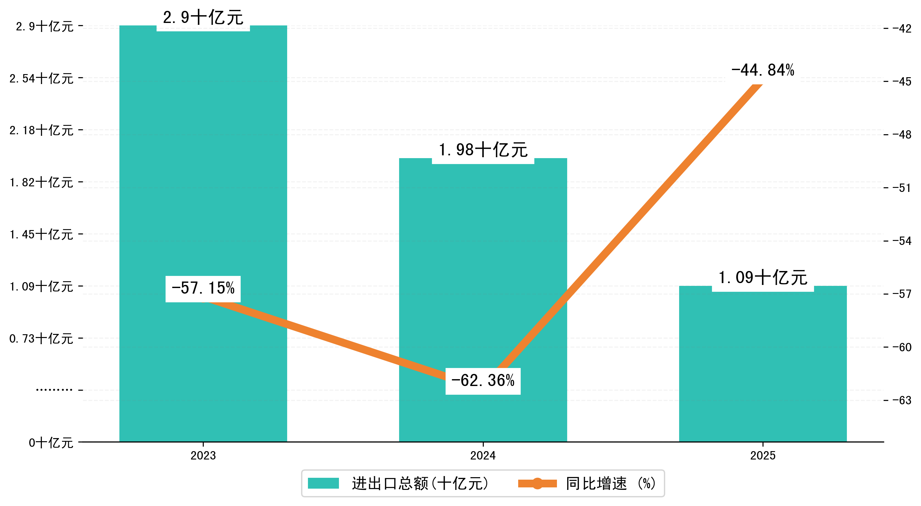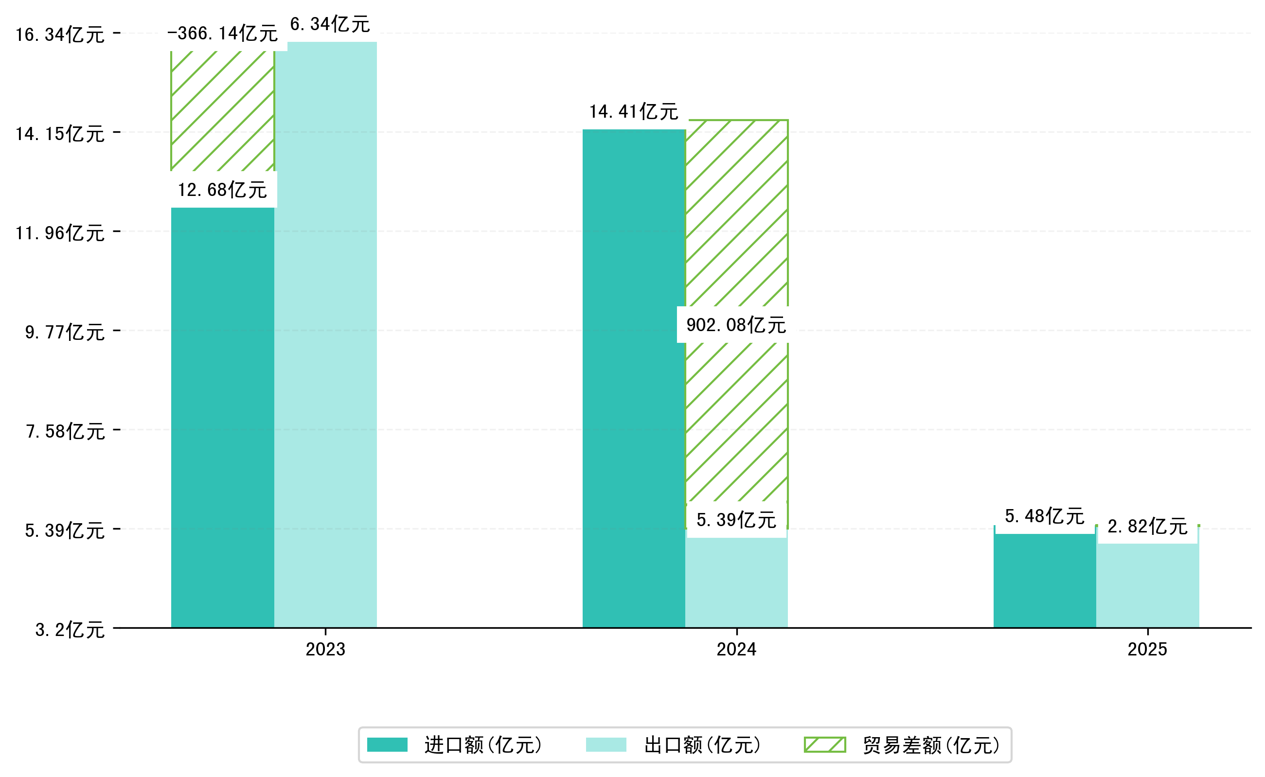 以人民币计,2025年1-2月兰州市贸易差额为282,1525万元(贸易逆差),相比上年同期增加了8,9925,4065万元,同比增加-99.69%。