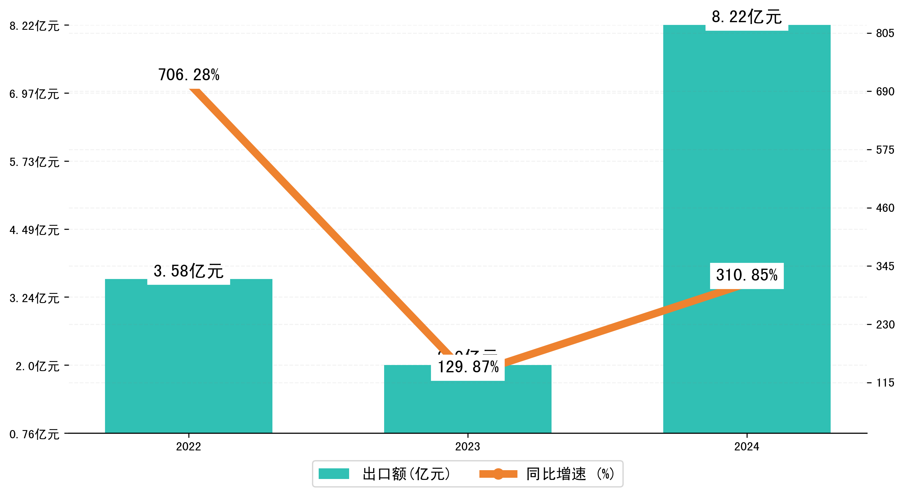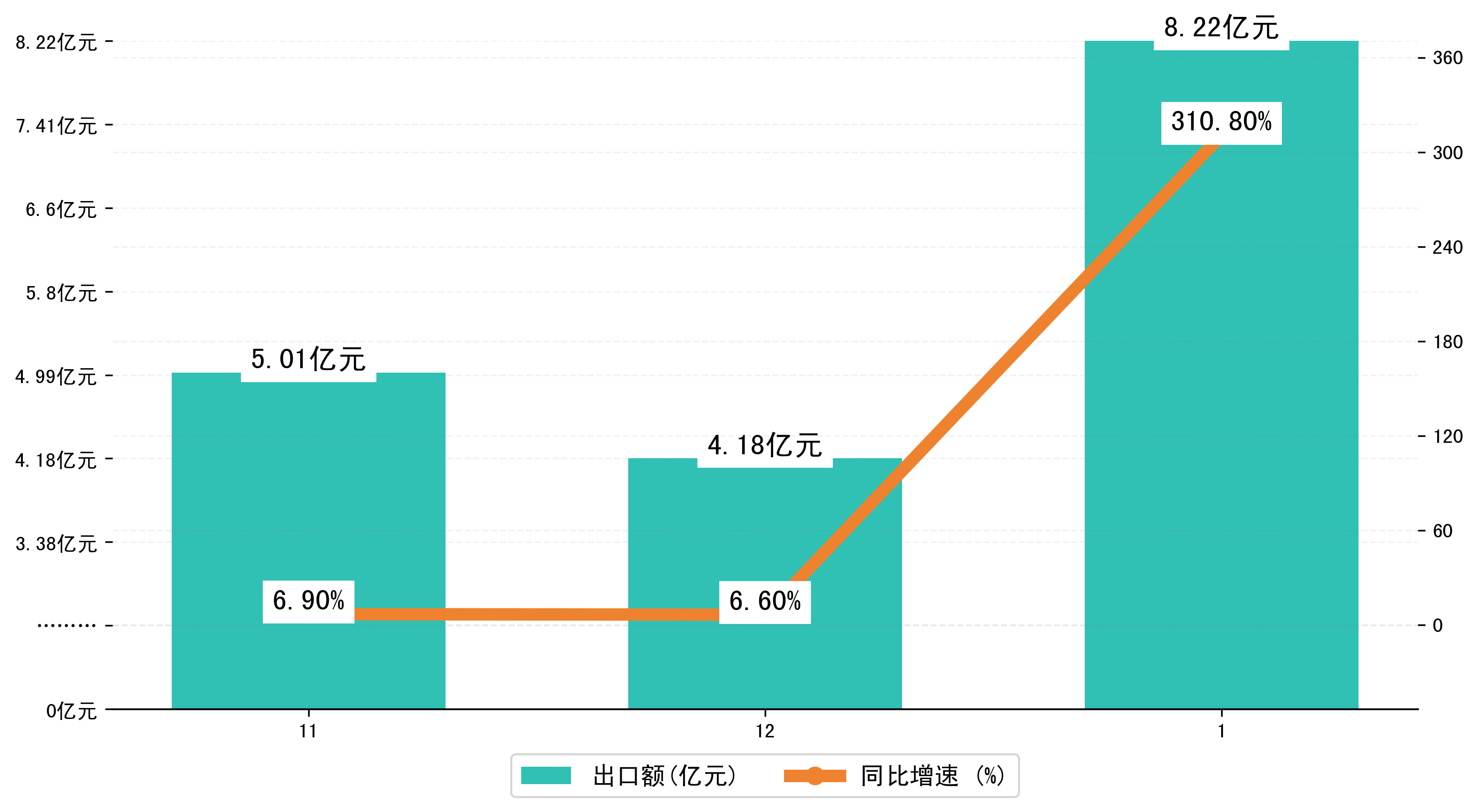 以人民币计,2024年1月拉萨市出口额为8,2186.4434万元,相比上月增加了4,0355.9237万元;相比上年同期增加了6,2182.2233万元,同比增加了310.80%。
