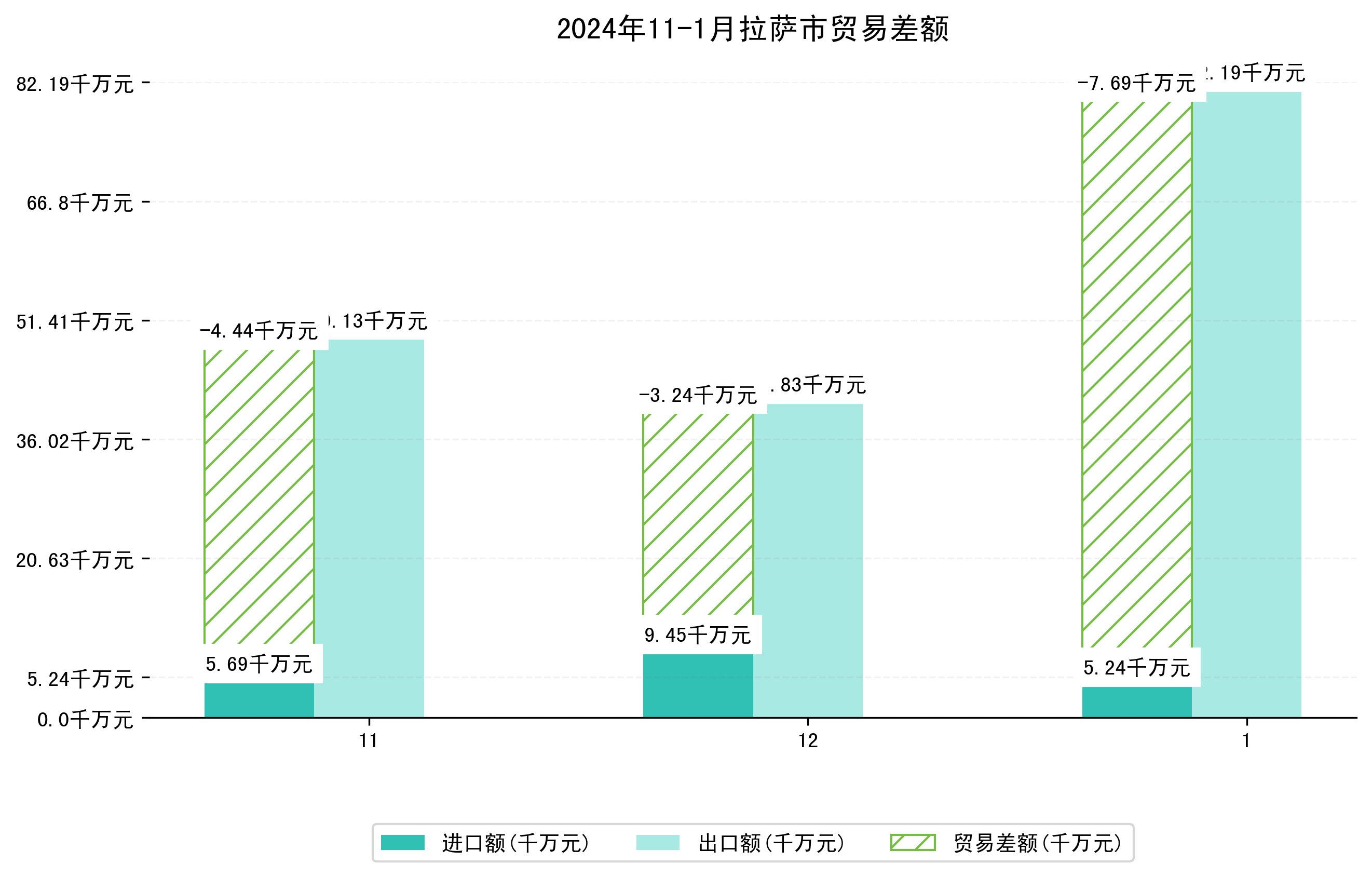 以人民币计,2024年1-1月拉萨市贸易差额为7,6949,6942万元(贸易顺差),相比上年同期增加了5,9652,8390万元,同比增加344.88%。