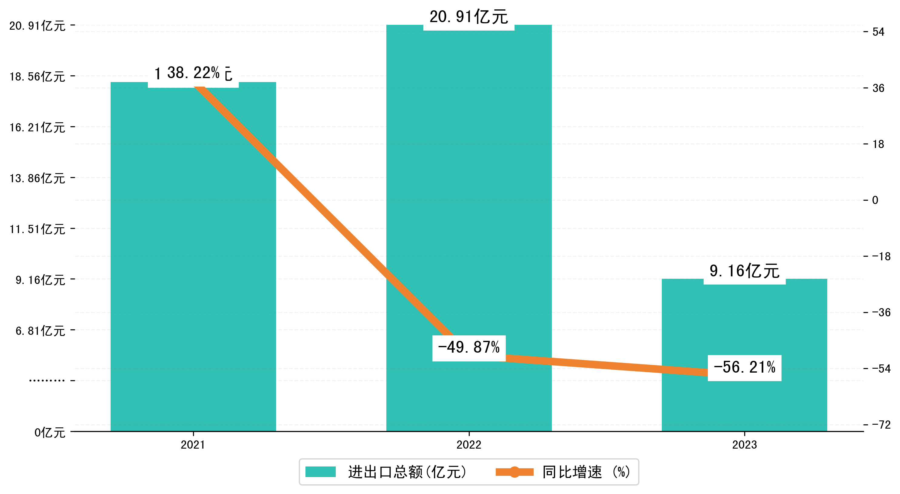 以人民币计,2023年1-6月拉萨市进出口总额为9,1563.3781万元,相比上年同期减少了11,7541.2947万元,同比减少了-56.30%。