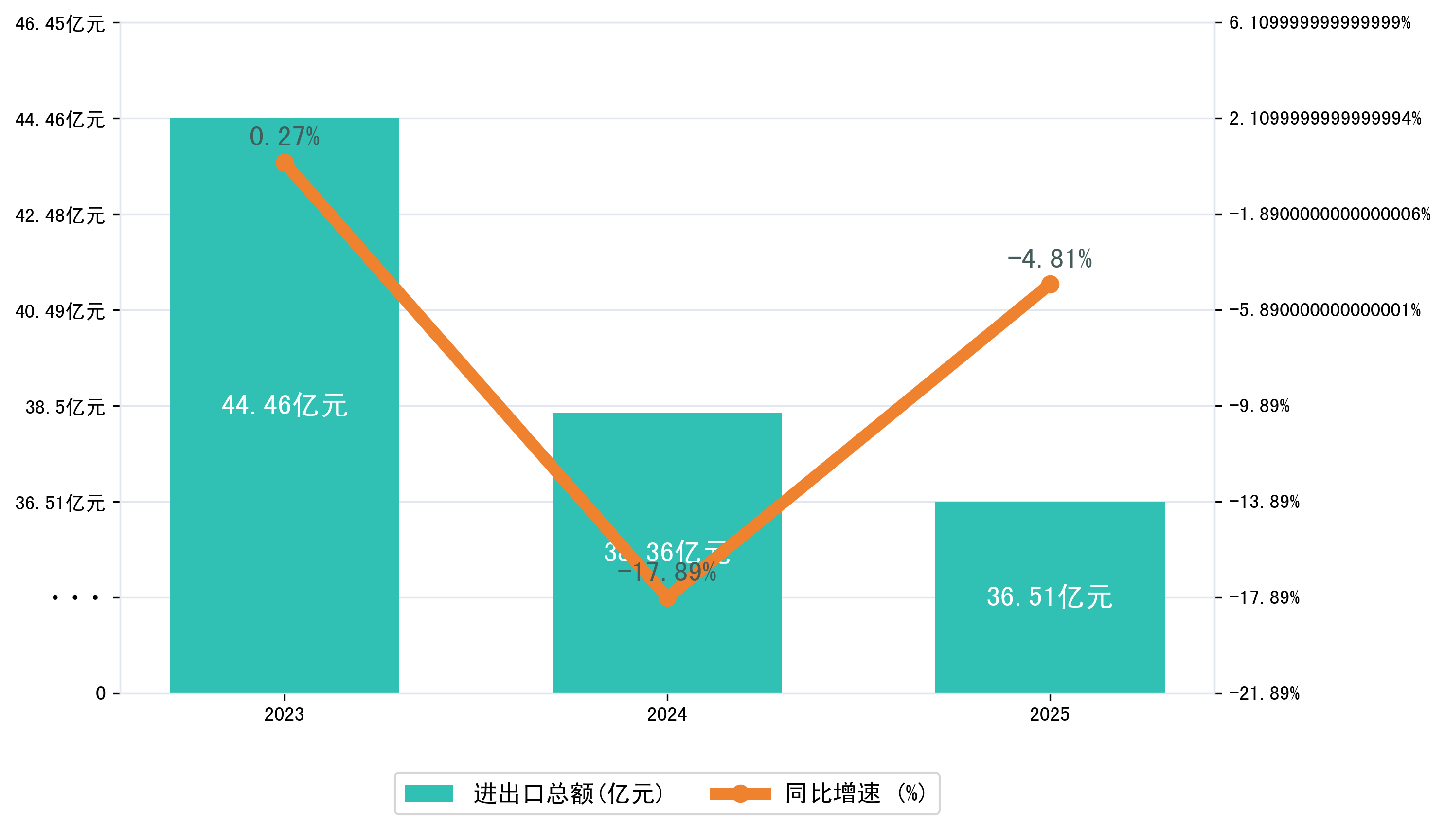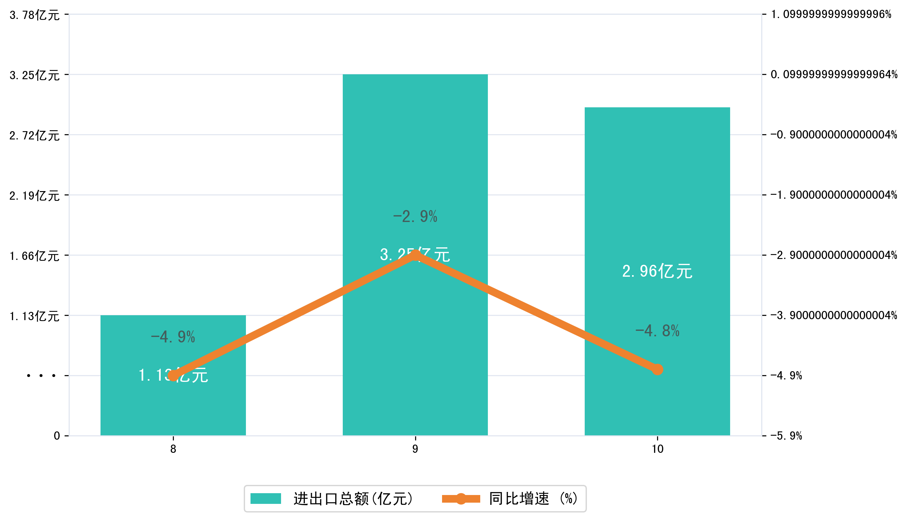 以人民币计,2025年1-10月拉萨市进出口总额为36,5110.7134万元,相比上年同期减少了1,8459.2637万元,同比减少了-4.80%。