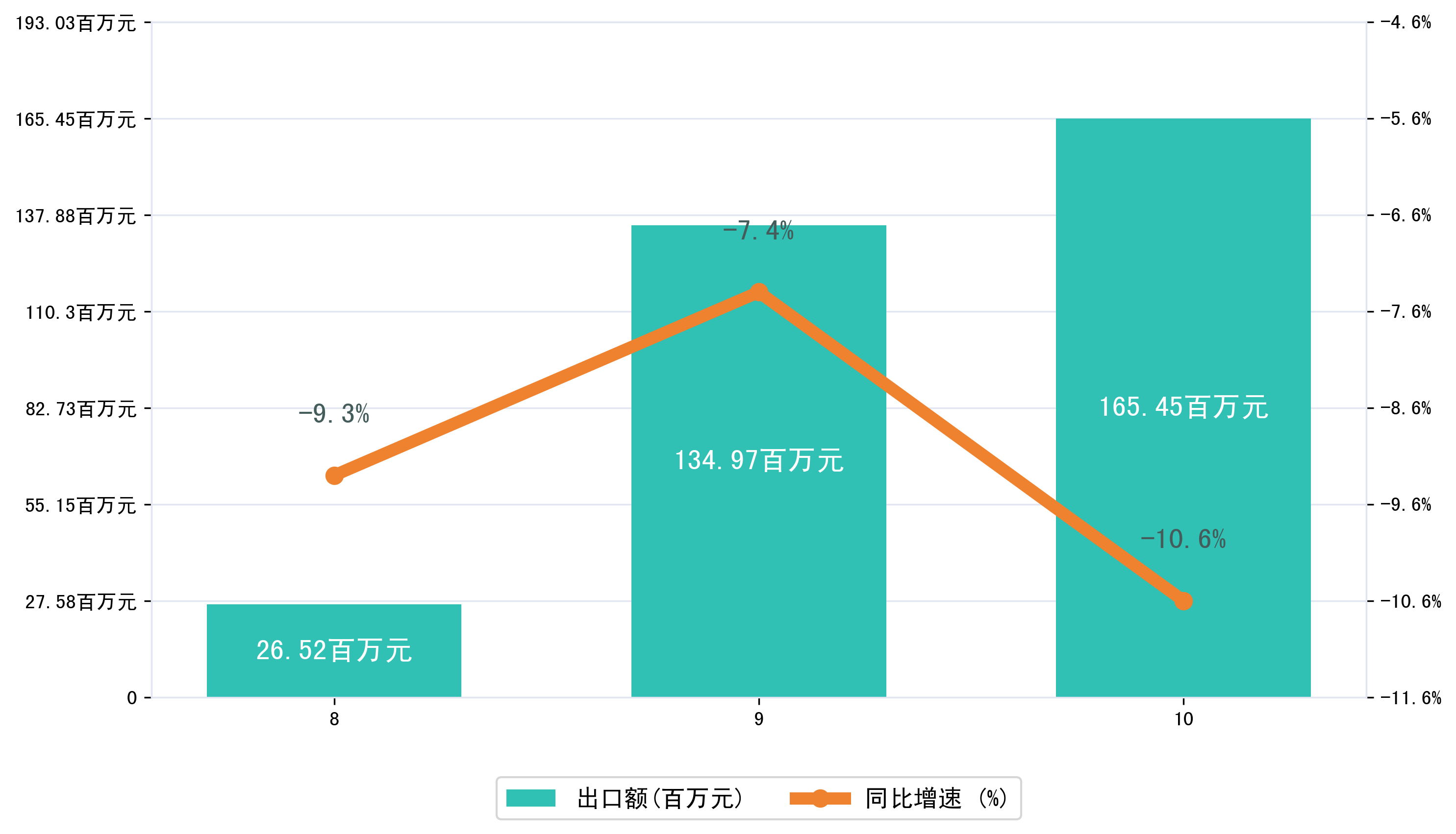 以人民币计,2025年10月拉萨市出口额为1,6545.4413万元,相比上月增加了3048.2527万元;相比上年同期减少了1,1269.1739万元,同比减少了-10.60%。