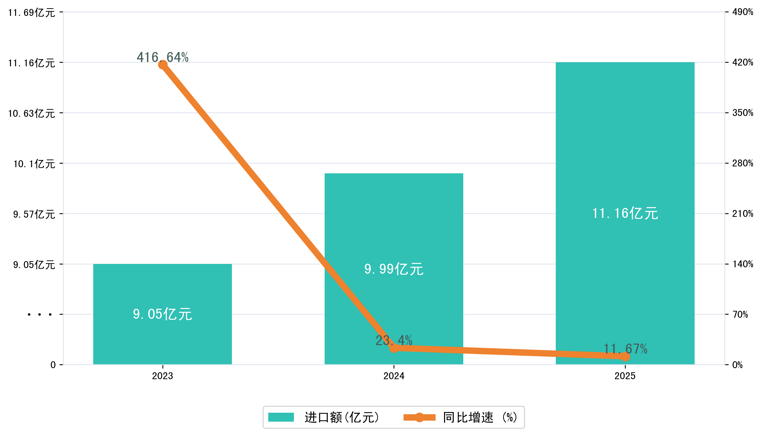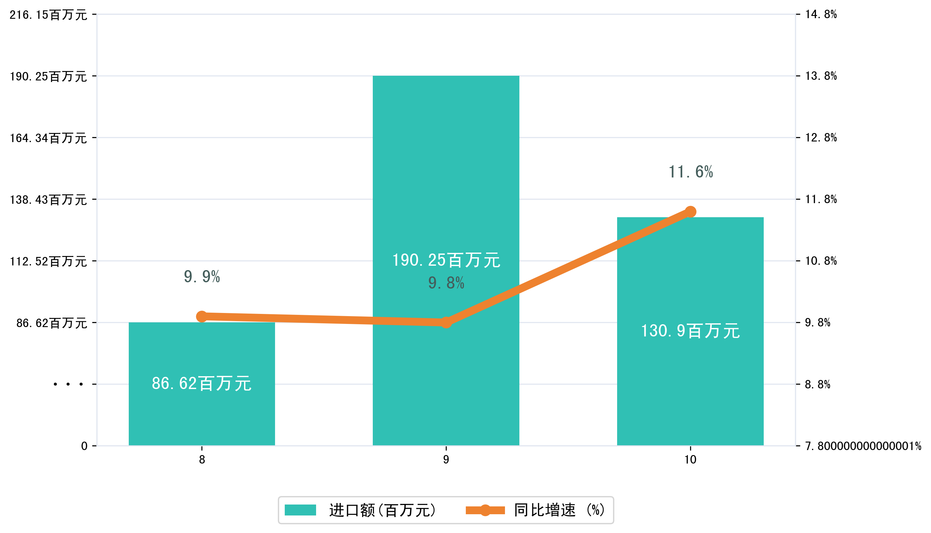 以人民币计,2025年1-10月拉萨市进口额为11,1613.9216万元,相比上年同期增加了1,1665.6478万元,同比增加了11.60%。