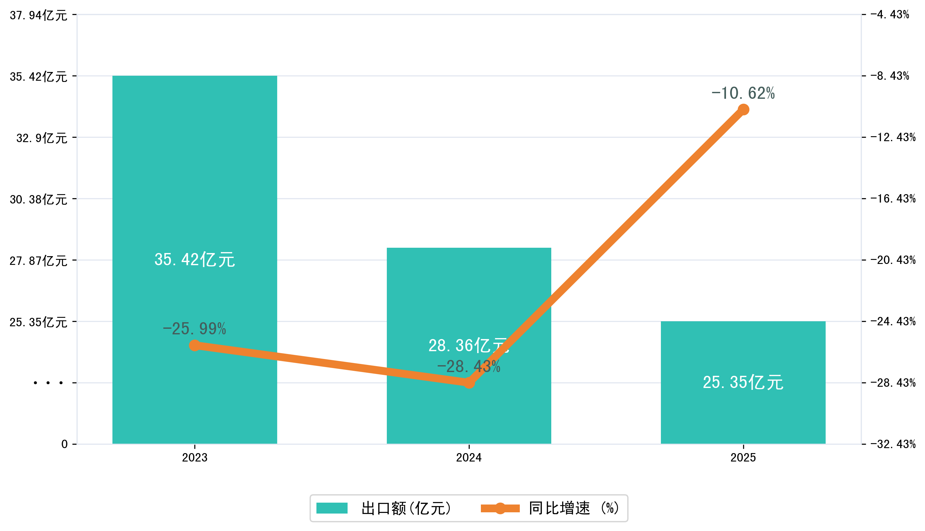 以美元计,2025年1-10月拉萨市出口额为3,5320.6319万美元,相比上年同期减少了4616.5617万美元,同比减少-11.60%。