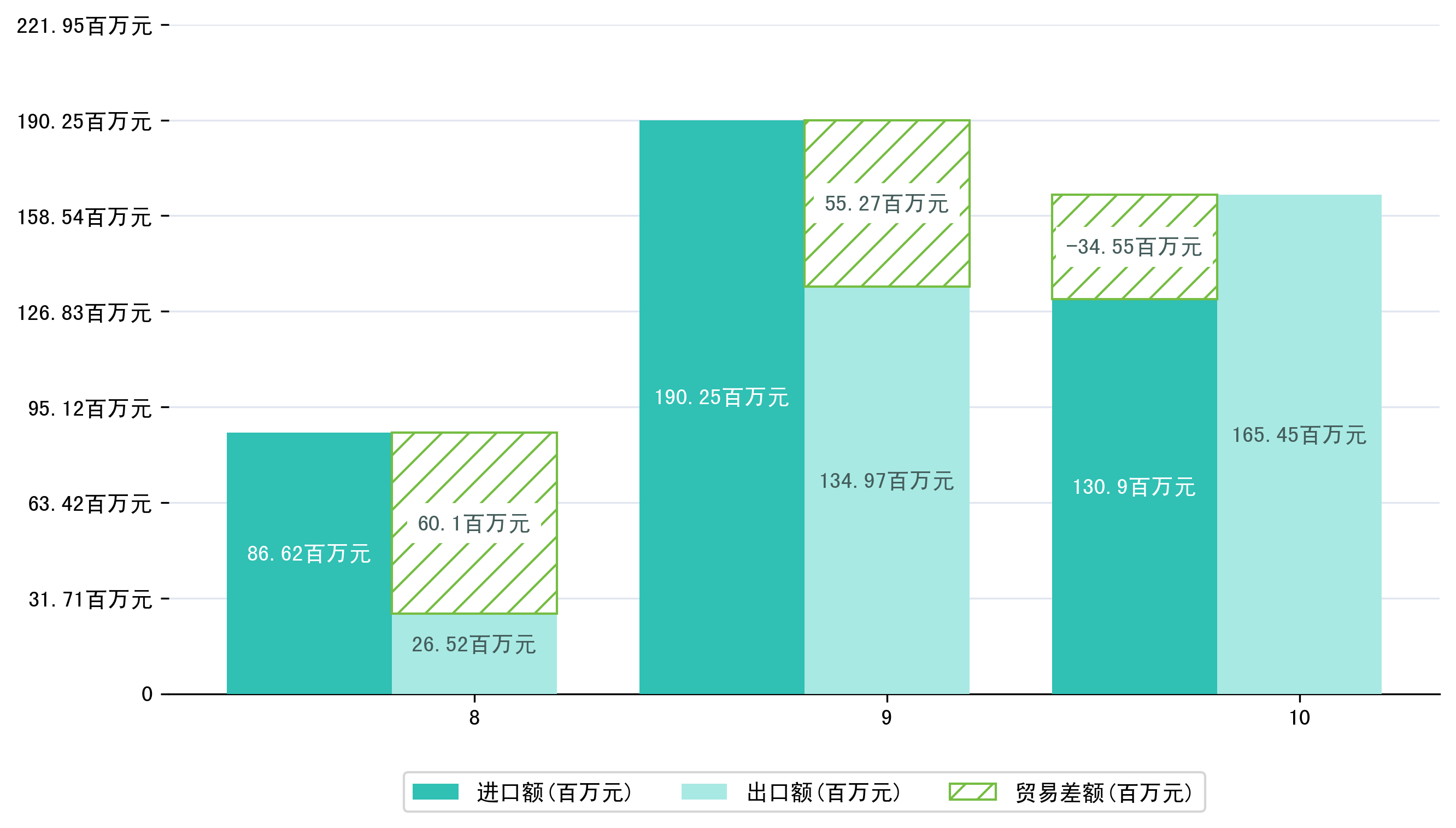 以美元计,2025年10月拉萨市进口额为1839.6188万美元,相比上月减少了826.8145万美元;相比上年同期增加了389.6479万美元,同比增加10.80%。