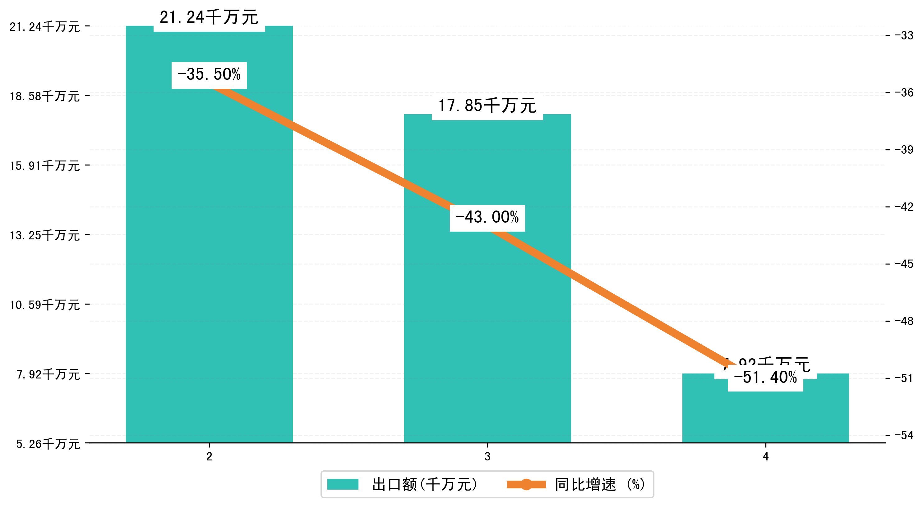 以人民币计,2023年1-4月拉萨市出口额为6,7015.4886万元,相比上年同期减少了7,0635.019万元,同比减少了-51.40%。