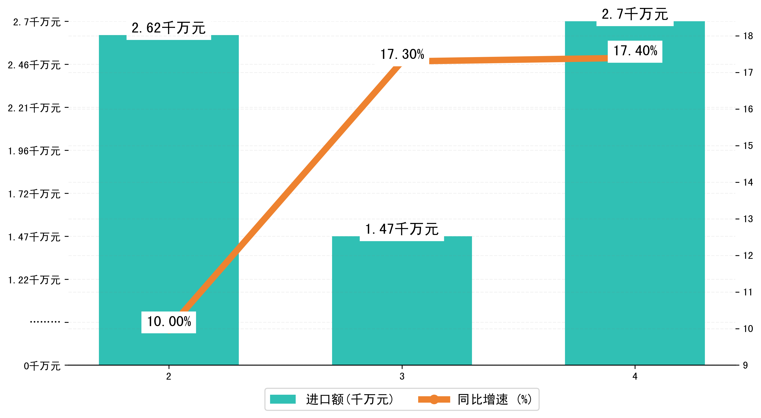 以人民币计,2023年4月拉萨市进口额为2702.7596万元,相比上月增加了1232.8333万元;相比上年同期增加了406.1153万元,同比增加了17.40%。