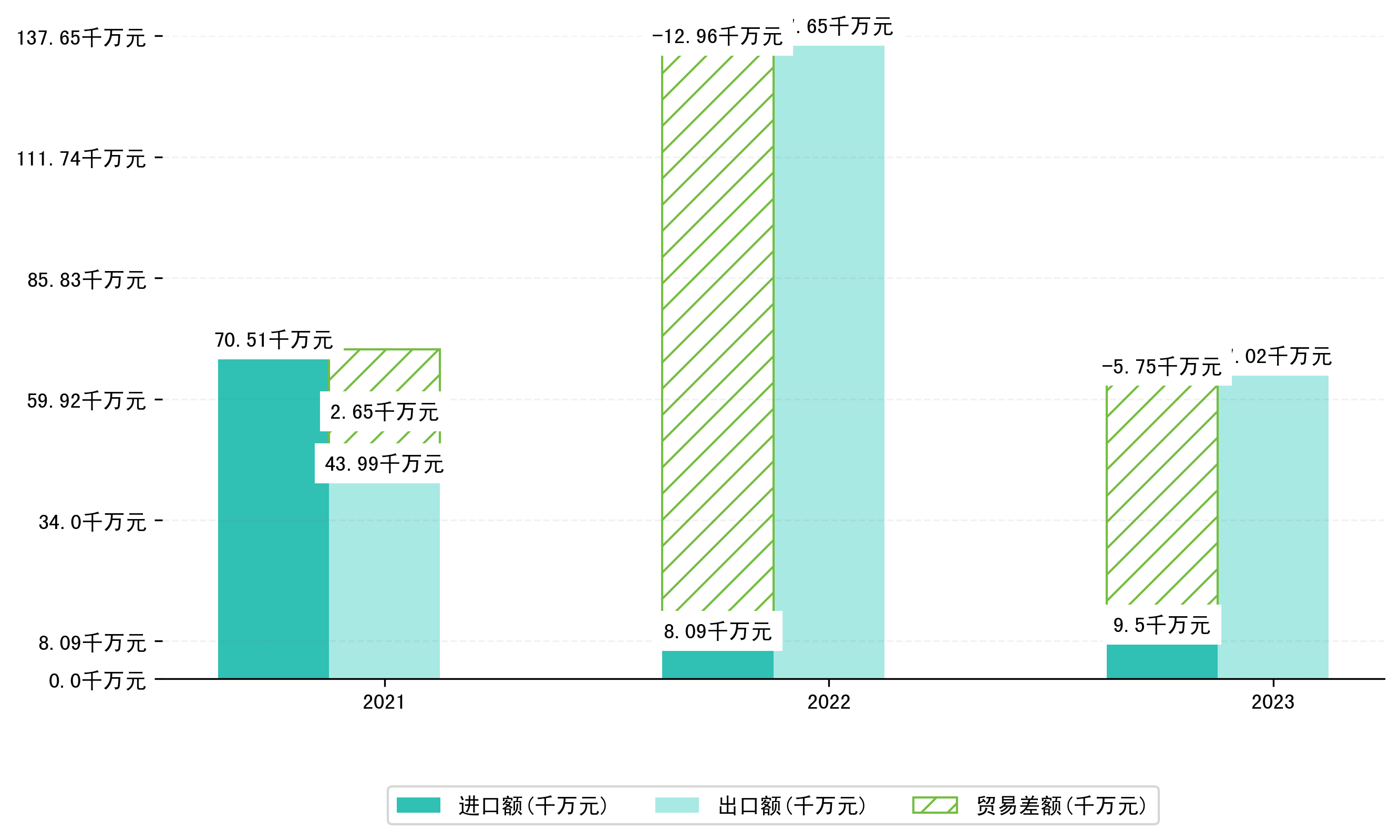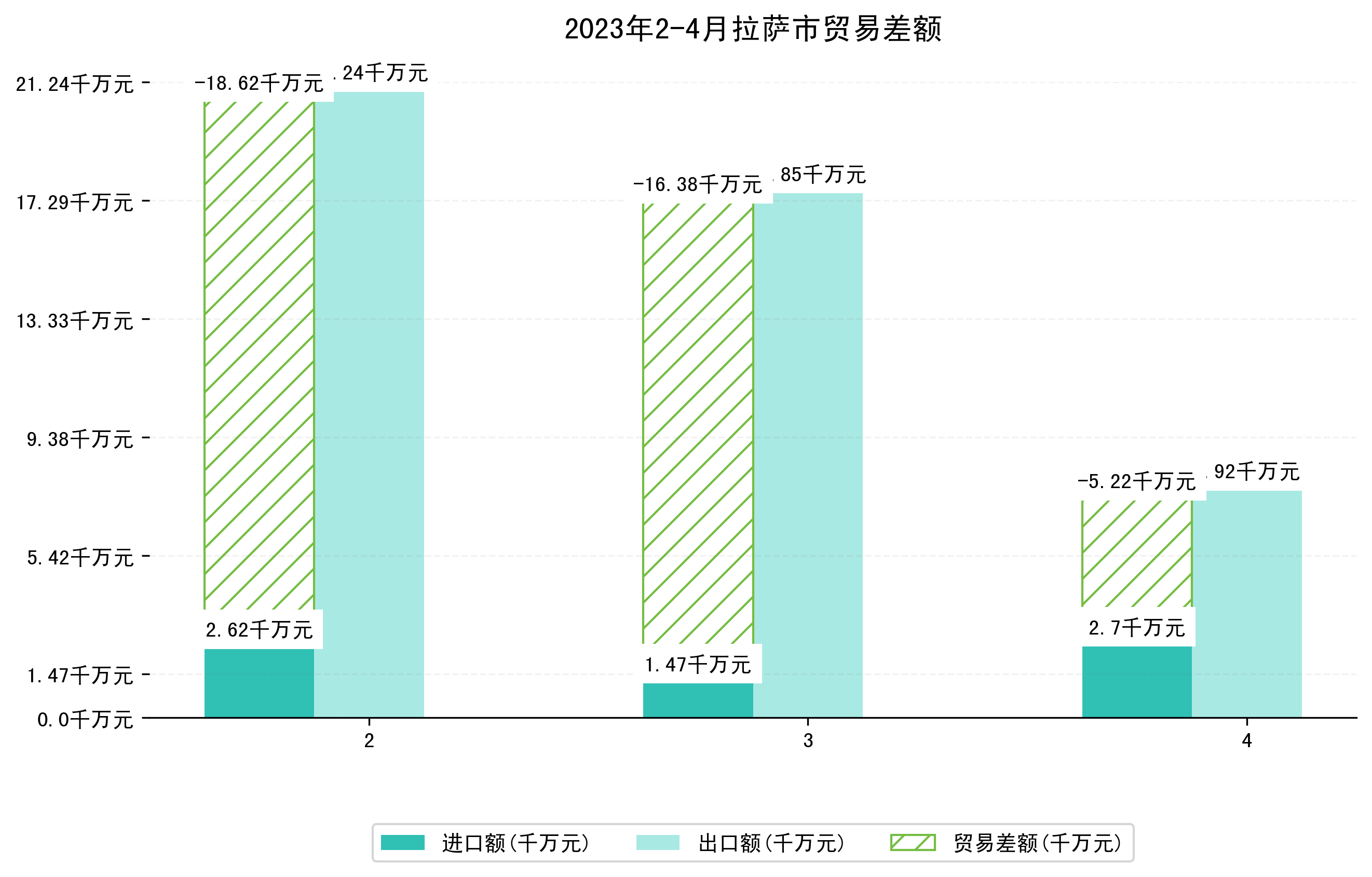 以人民币计,2023年1-4月拉萨市贸易差额为5,7512,2796万元(贸易顺差),相比上年同期减少了7,2045,9440万元,同比减少-55.61%。