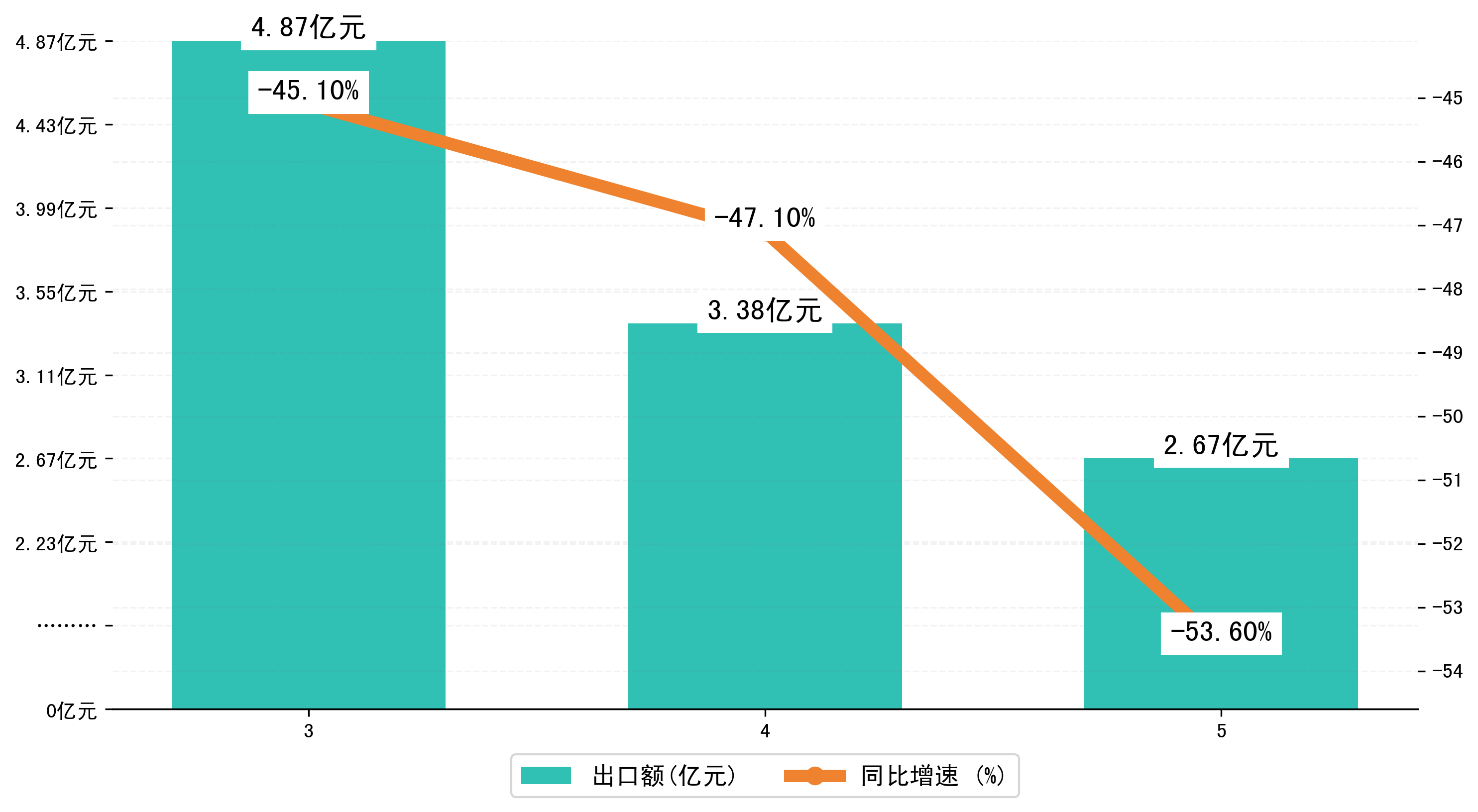 以美元计,2023年5月乐山市出口额为3884.2448万美元,相比上月减少了1046.1868万美元;相比上年同期减少了1,3500.0165万美元,同比减少-57.00%。