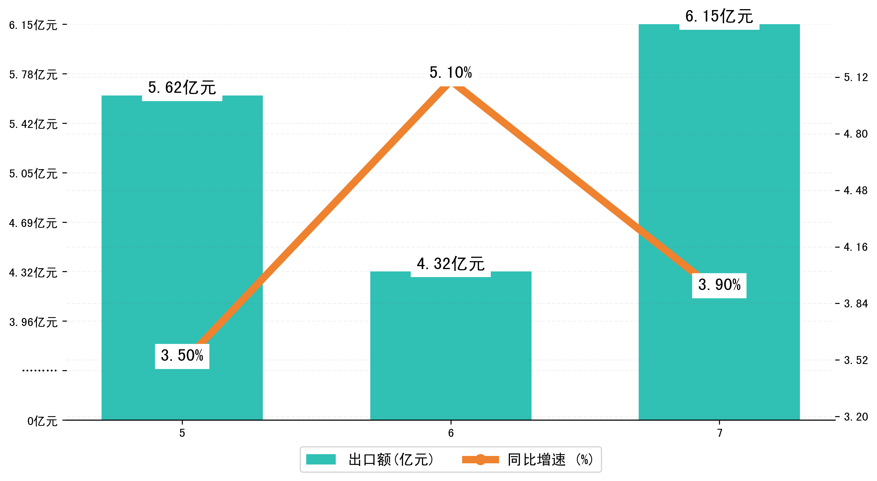 以美元计,2024年1-7月乐山市贸易差额为3,6108,4608万美元(贸易顺差),相比上年同期增加了3768,6563万美元,同比增加11.65%。