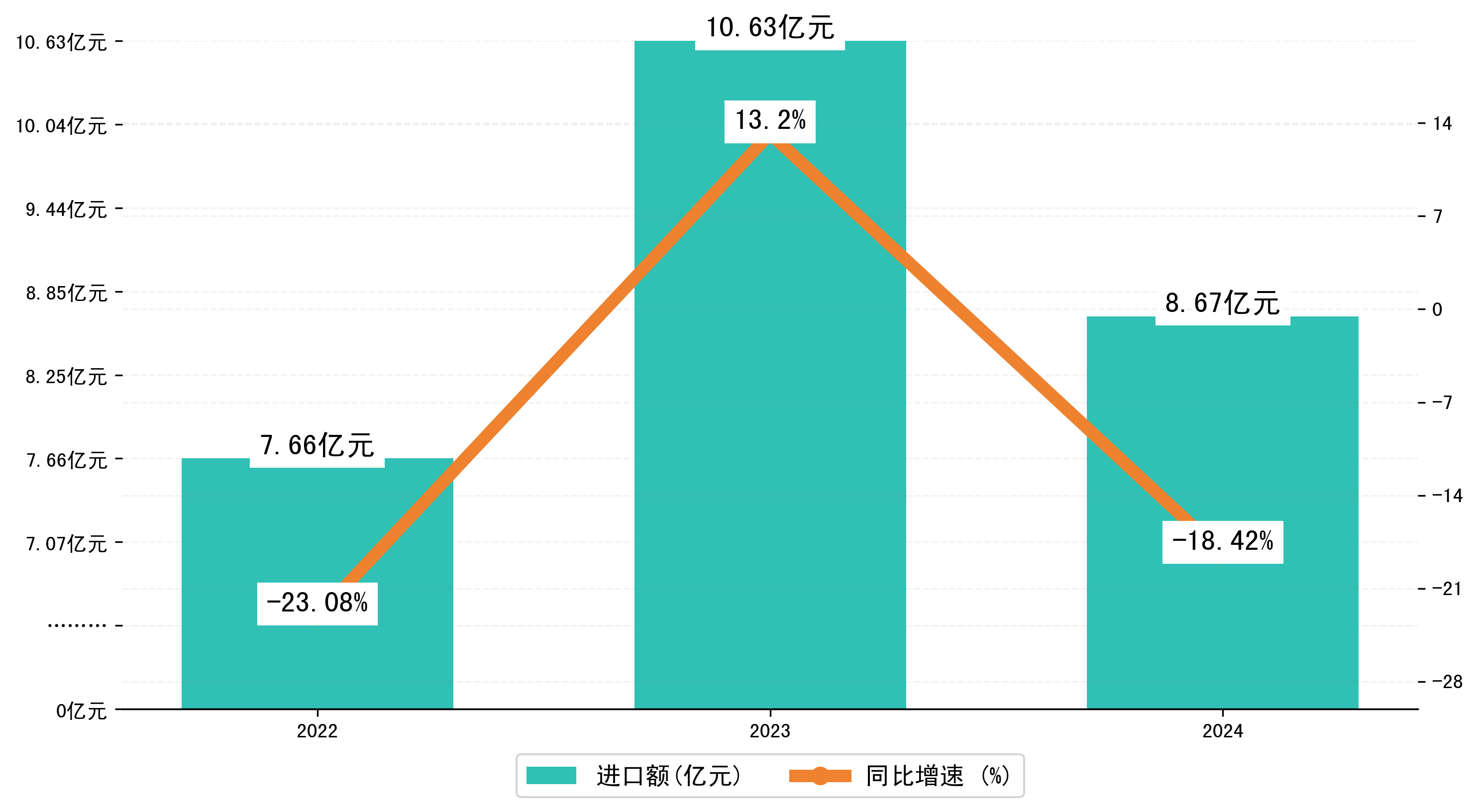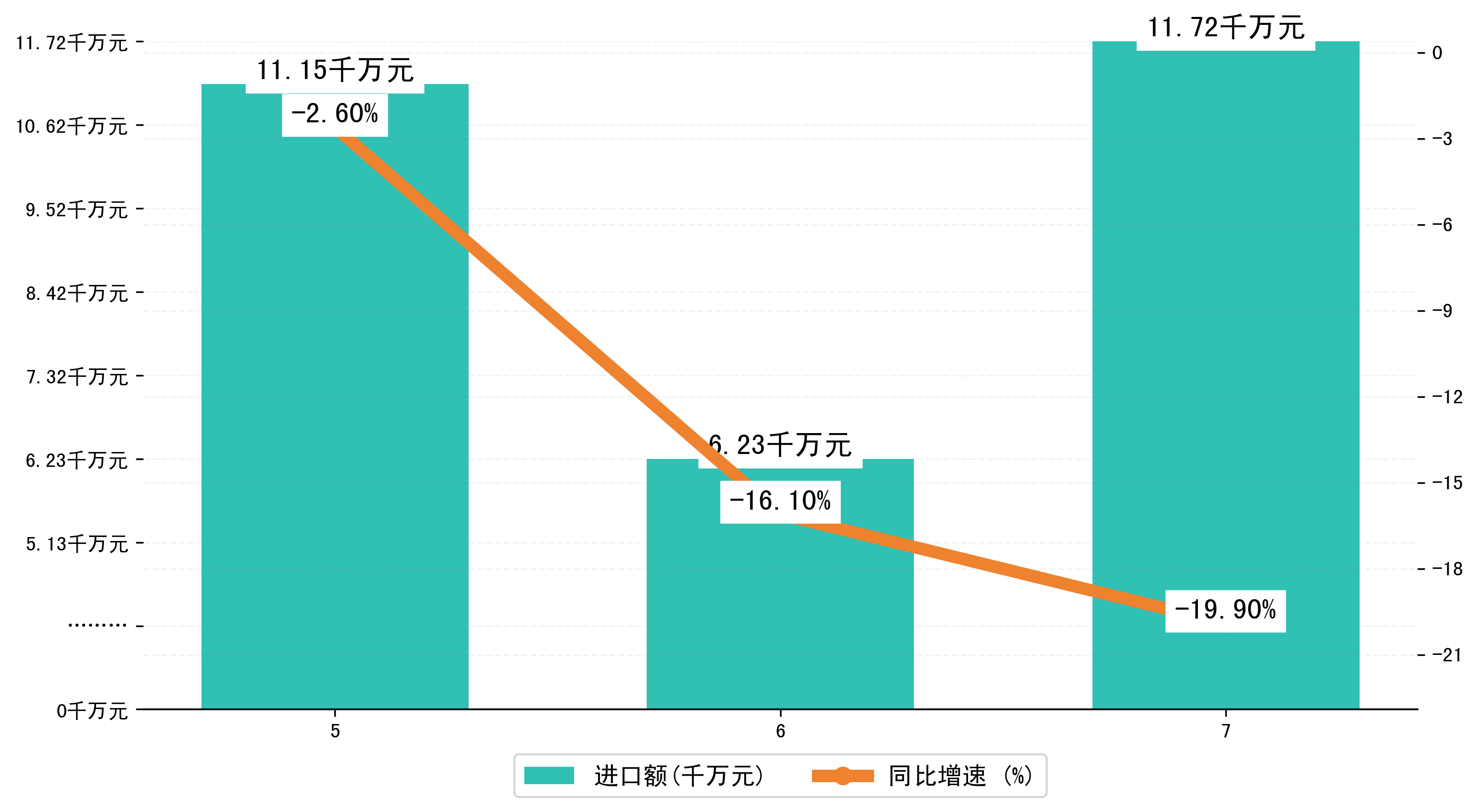 以人民币计,2024年1-7月乐山市进口额为8,6707.2519万元,相比上年同期减少了1,9581.3344万元,同比减少了-19.90%。