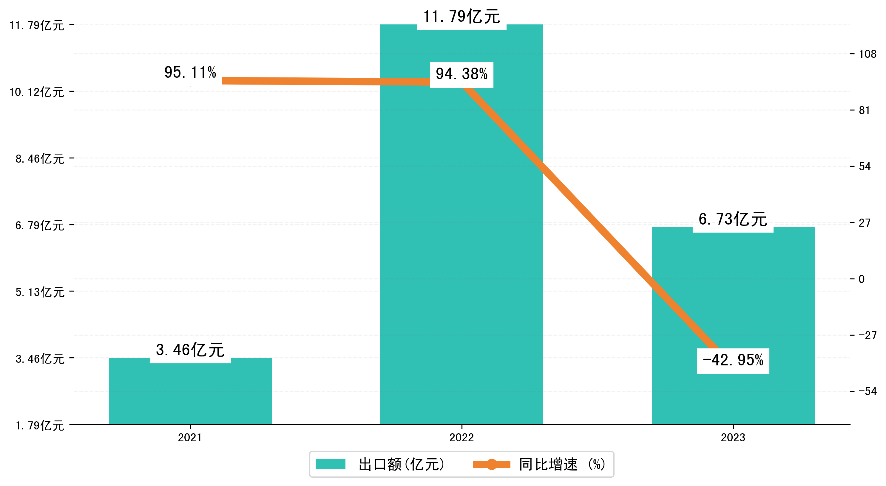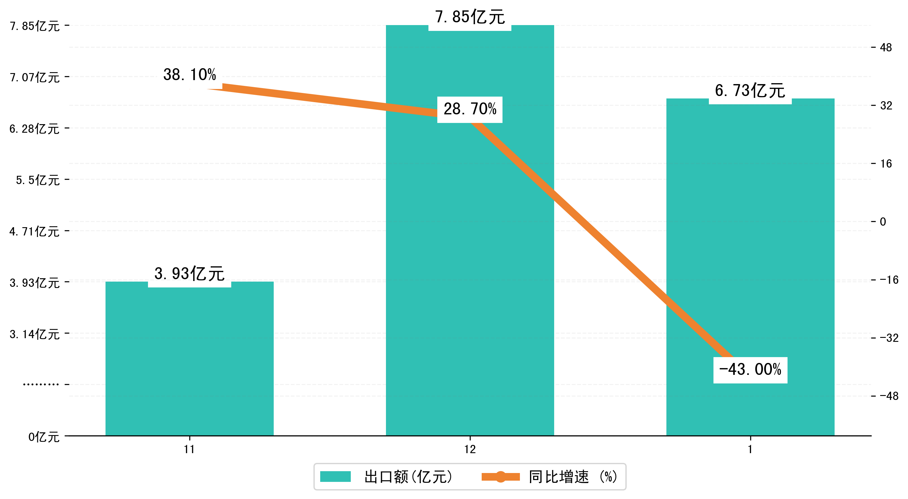 以人民币计,2023年1-1月乐山市出口额为6,7262.5359万元,相比上年同期减少了5,0643.694万元,同比减少了-43.00%。
