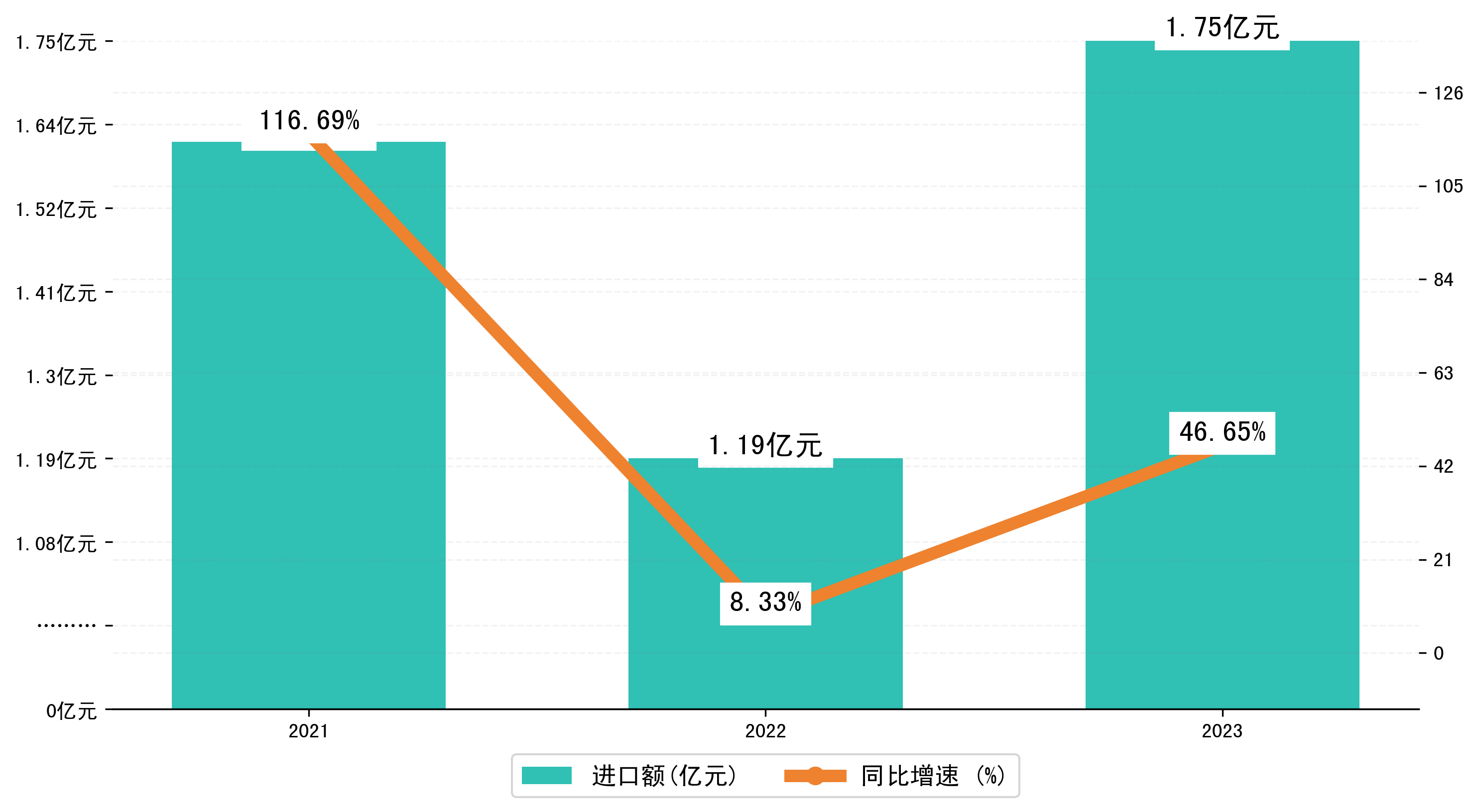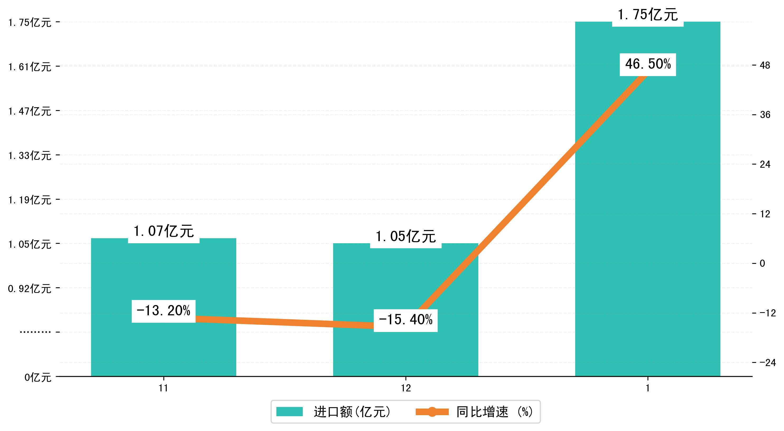 以人民币计,2023年1-1月乐山市进口额为1,7470.4232万元,相比上年同期增加了5557.682万元,同比增加了46.50%。