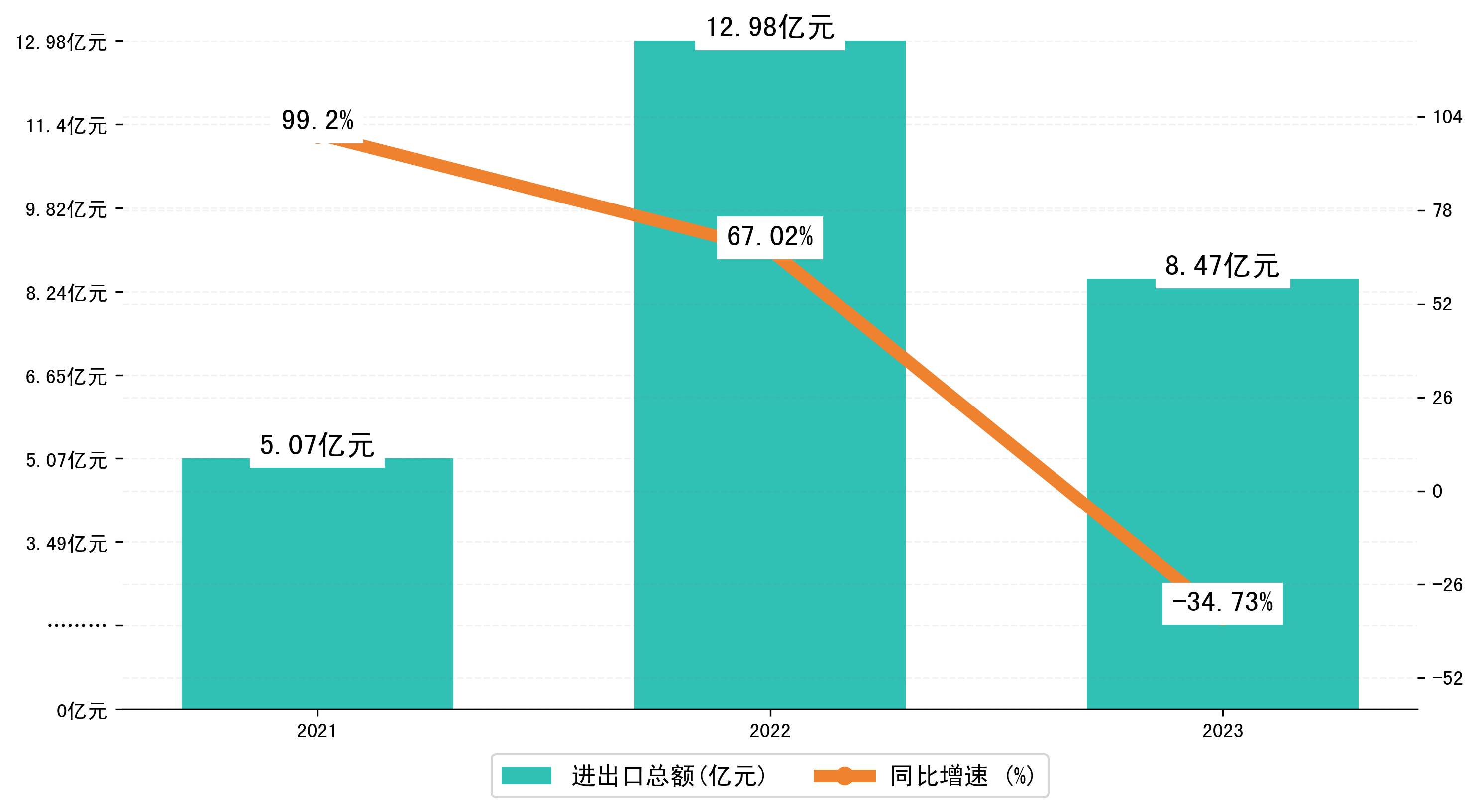 以人民币计,2023年1-1月乐山市进出口总额为8,4732.9592万元,相比上年同期减少了4,5086.0119万元,同比减少了-34.70%。
