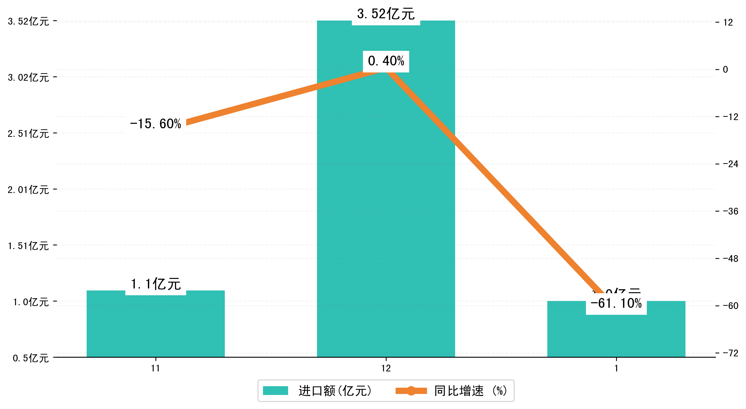 以美元计,2025年1-1月乐山市进口额为1394.9759万美元,相比上年同期减少了2245.398万美元,同比减少-61.70%。
