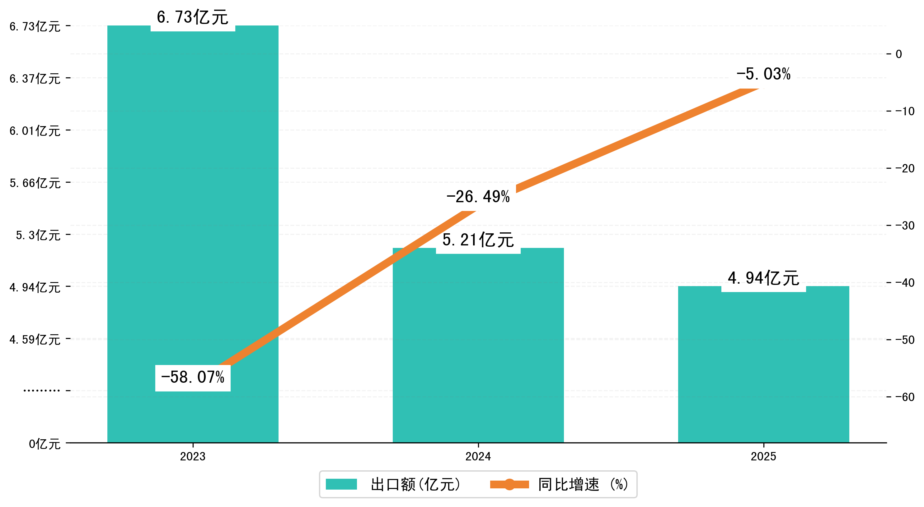 以美元计,2025年1-1月乐山市出口额为6876.7224万美元,相比上年同期减少了438.0595万美元,同比减少-6.00%。