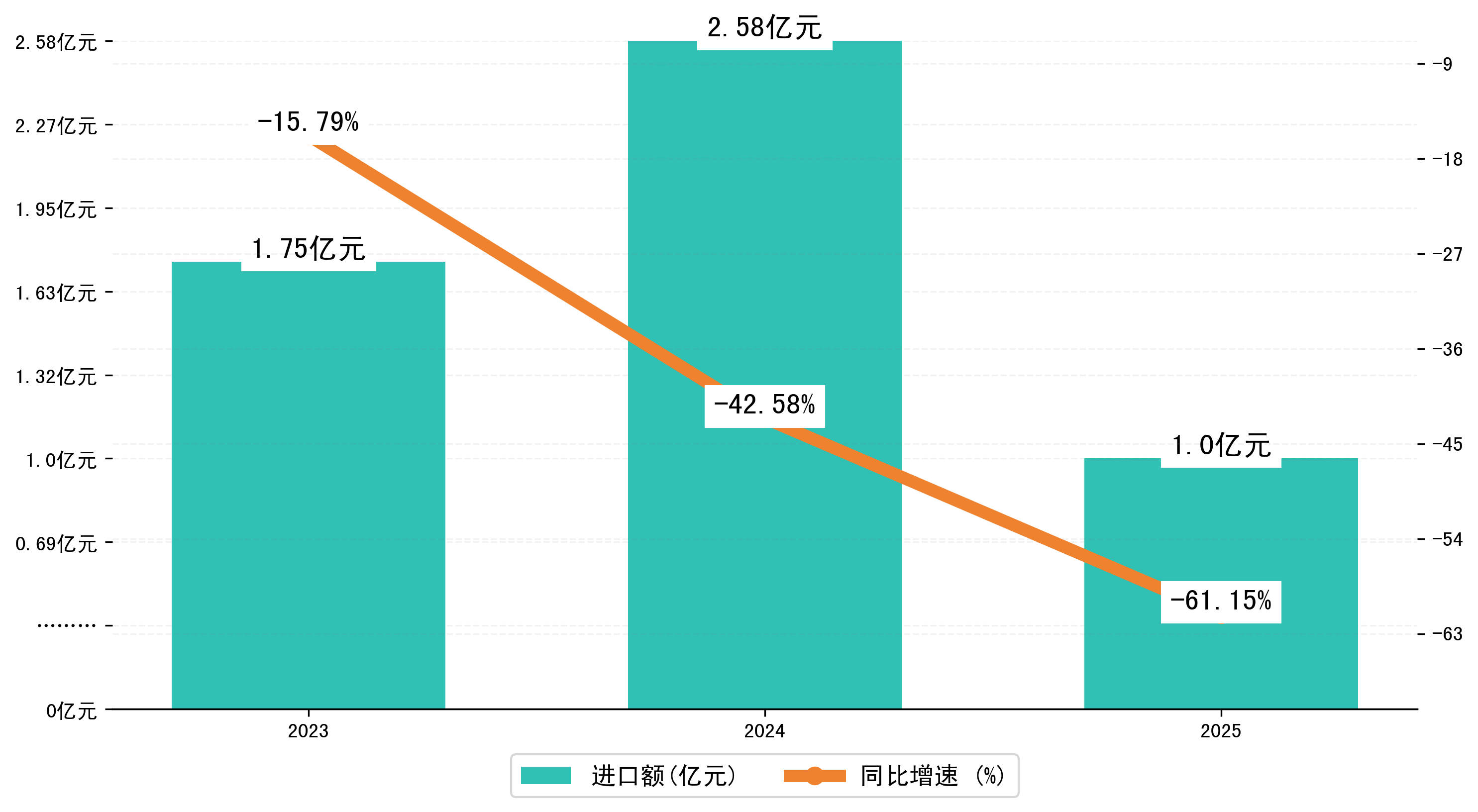 以人民币计,2025年1-1月乐山市进口额为1,0031.554万元,相比上年同期减少了1,5789.2332万元,同比减少了-61.10%。