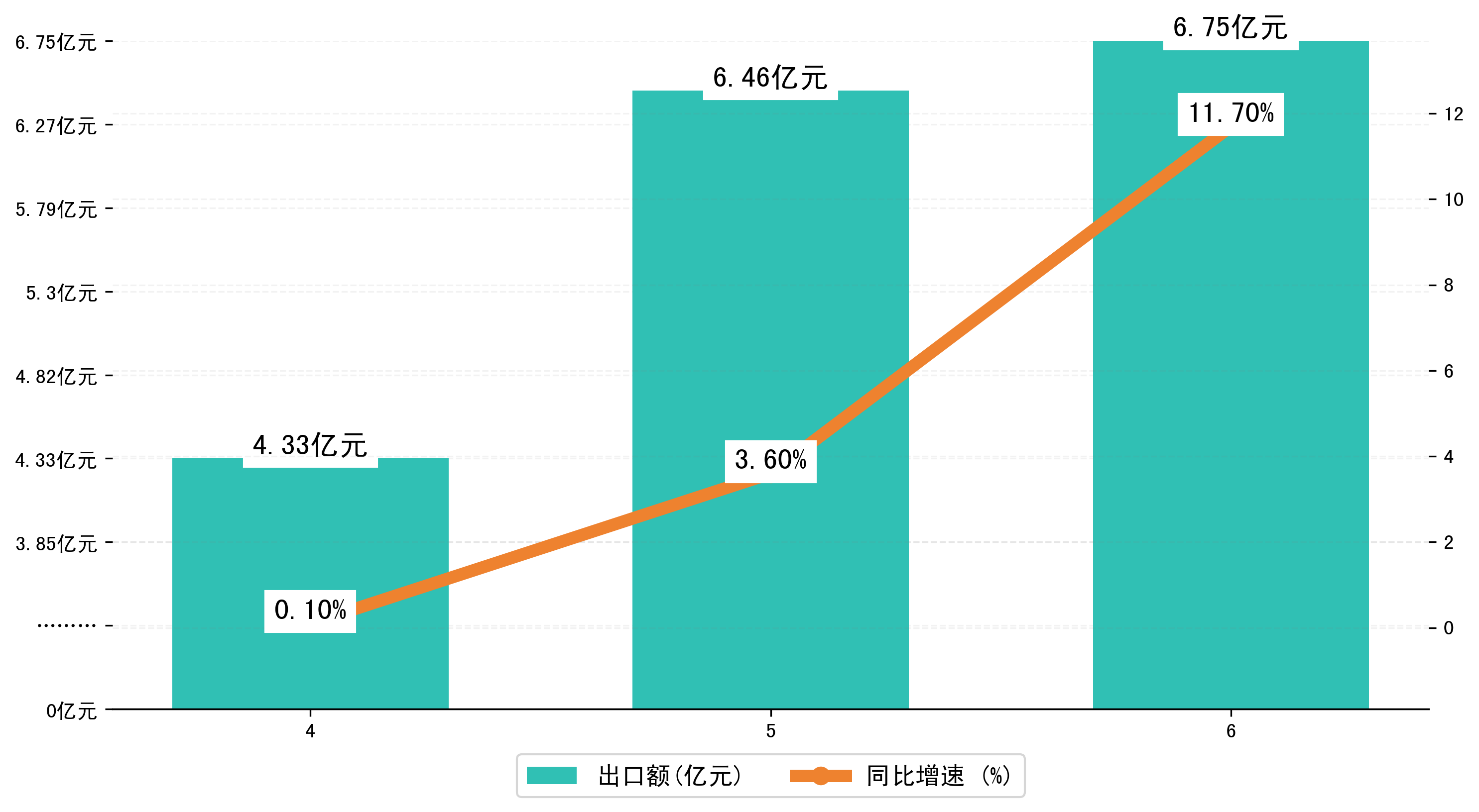 以人民币计,2025年6月乐山市出口额为6,7542.8618万元,相比上月增加了2906.4171万元;相比上年同期增加了2,4295.2346万元,同比增加了11.70%。