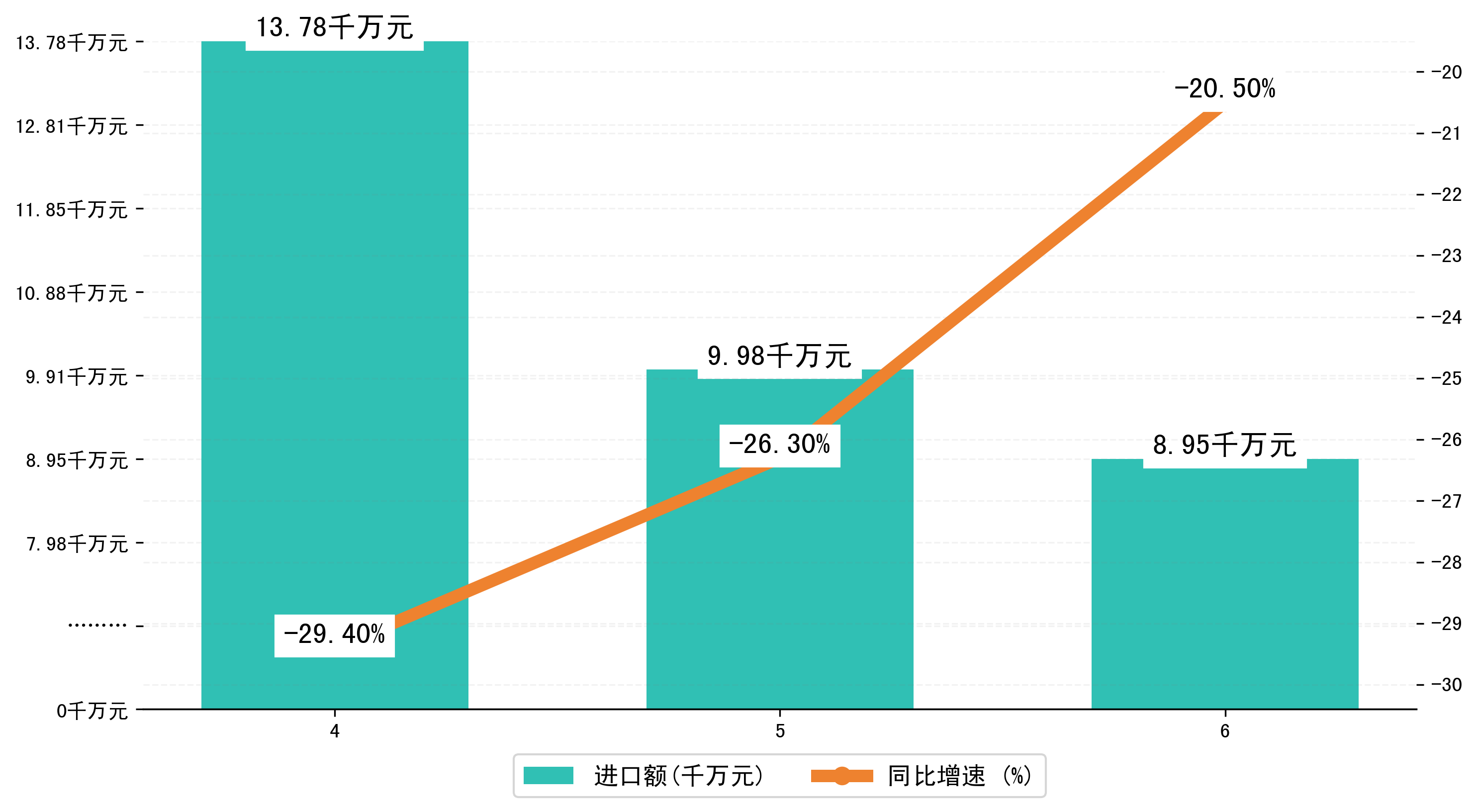 以人民币计,2025年1-6月乐山市进口额为5,9808.2314万元,相比上年同期减少了1,5202.278万元,同比减少了-20.50%。
