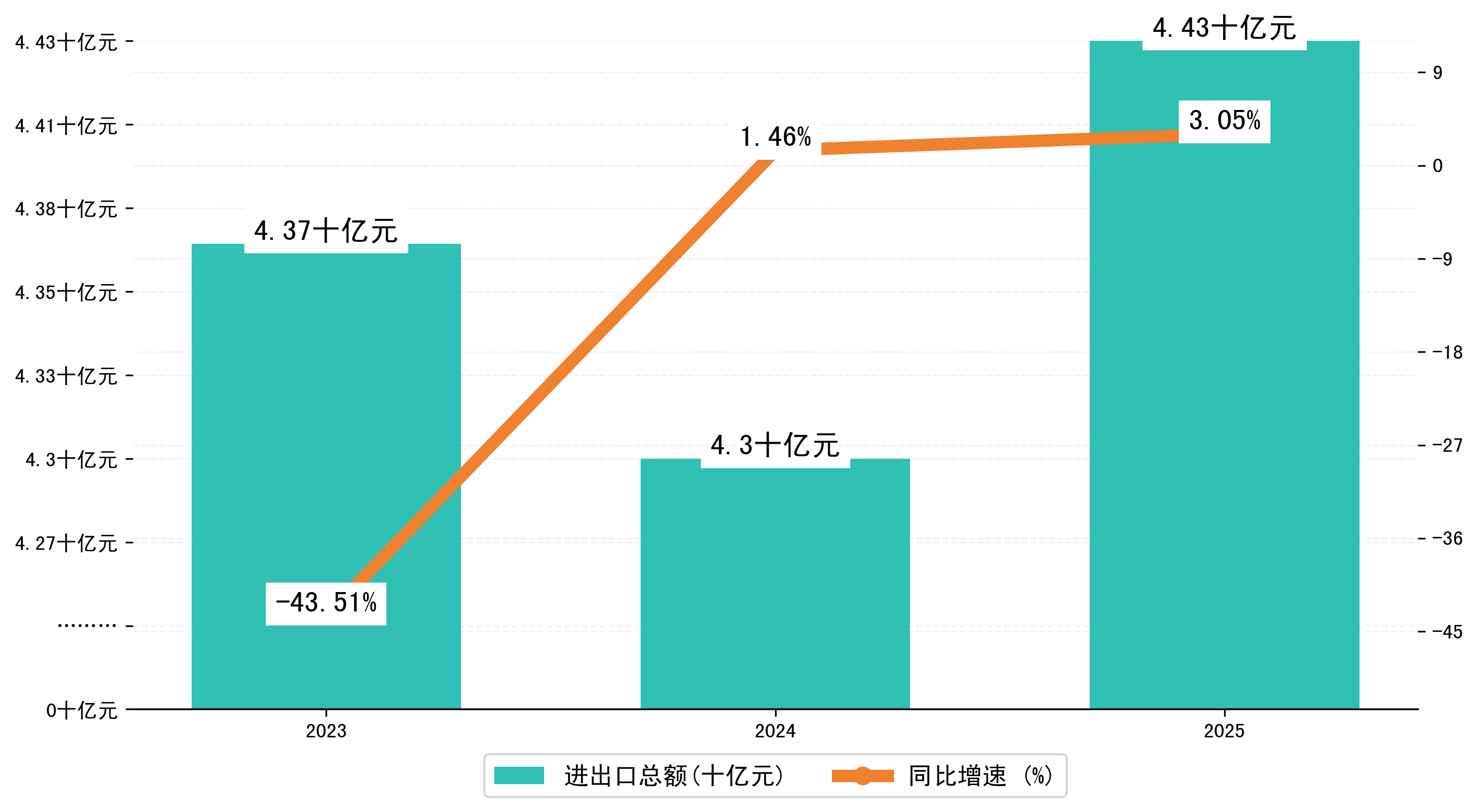 以人民币计,2025年1-7月乐山市进出口总额为44,3231.7142万元,相比上年同期增加了1,3117.3579万元,同比增加了3.00%。