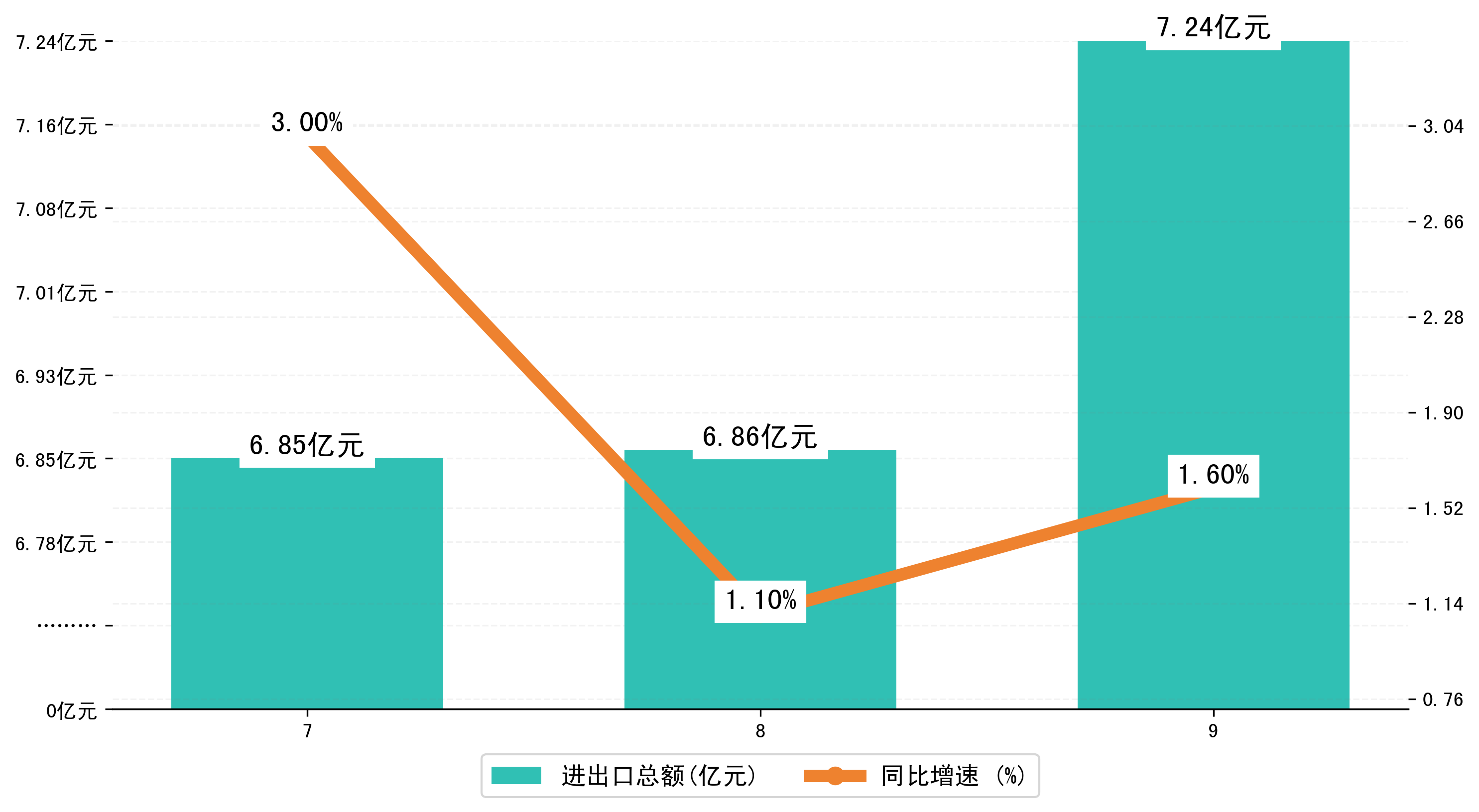 以人民币计,2025年9月乐山市进出口总额为7,2397.0273万元,相比上月增加了3791.0482万元;相比上年同期增加了4912.6939万元,同比增加了1.60%。