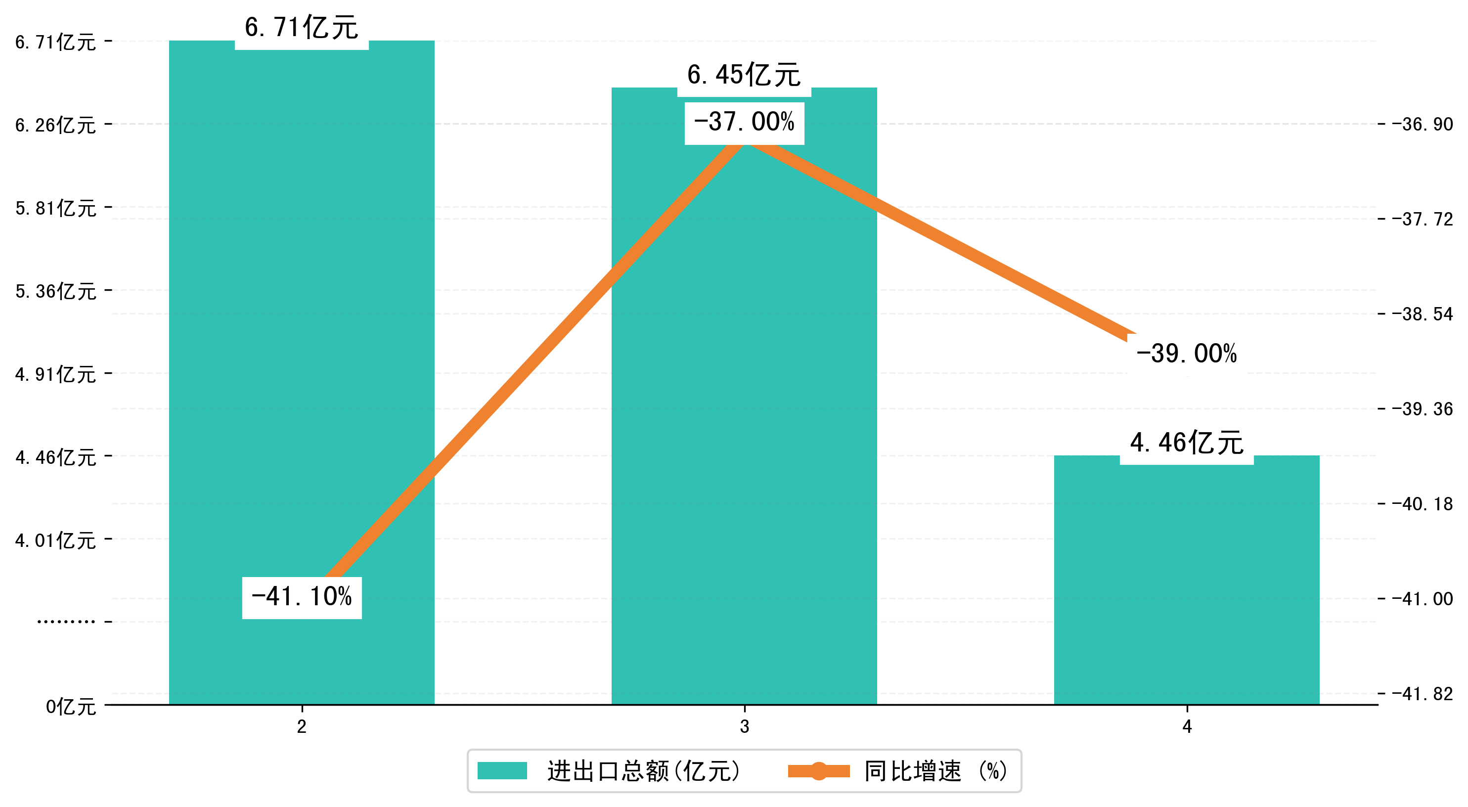 以人民币计,2023年4月乐山市进出口总额为4,4572.7456万元,相比上月减少了1,9963.9608万元;相比上年同期减少了3,9805.4986万元,同比减少了-39.00%。