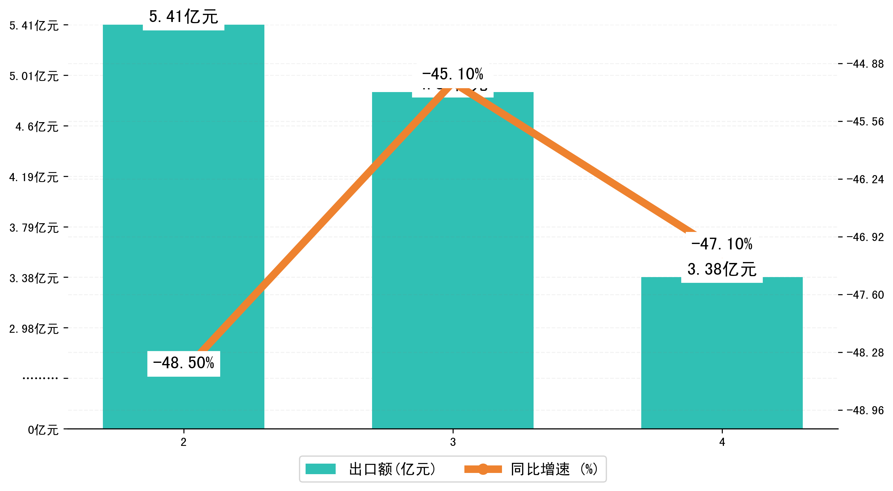 以人民币计,2023年4月乐山市出口额为3,3836.03万元,相比上月减少了1,4870.9386万元;相比上年同期减少了4,1678.536万元,同比减少了-47.10%。