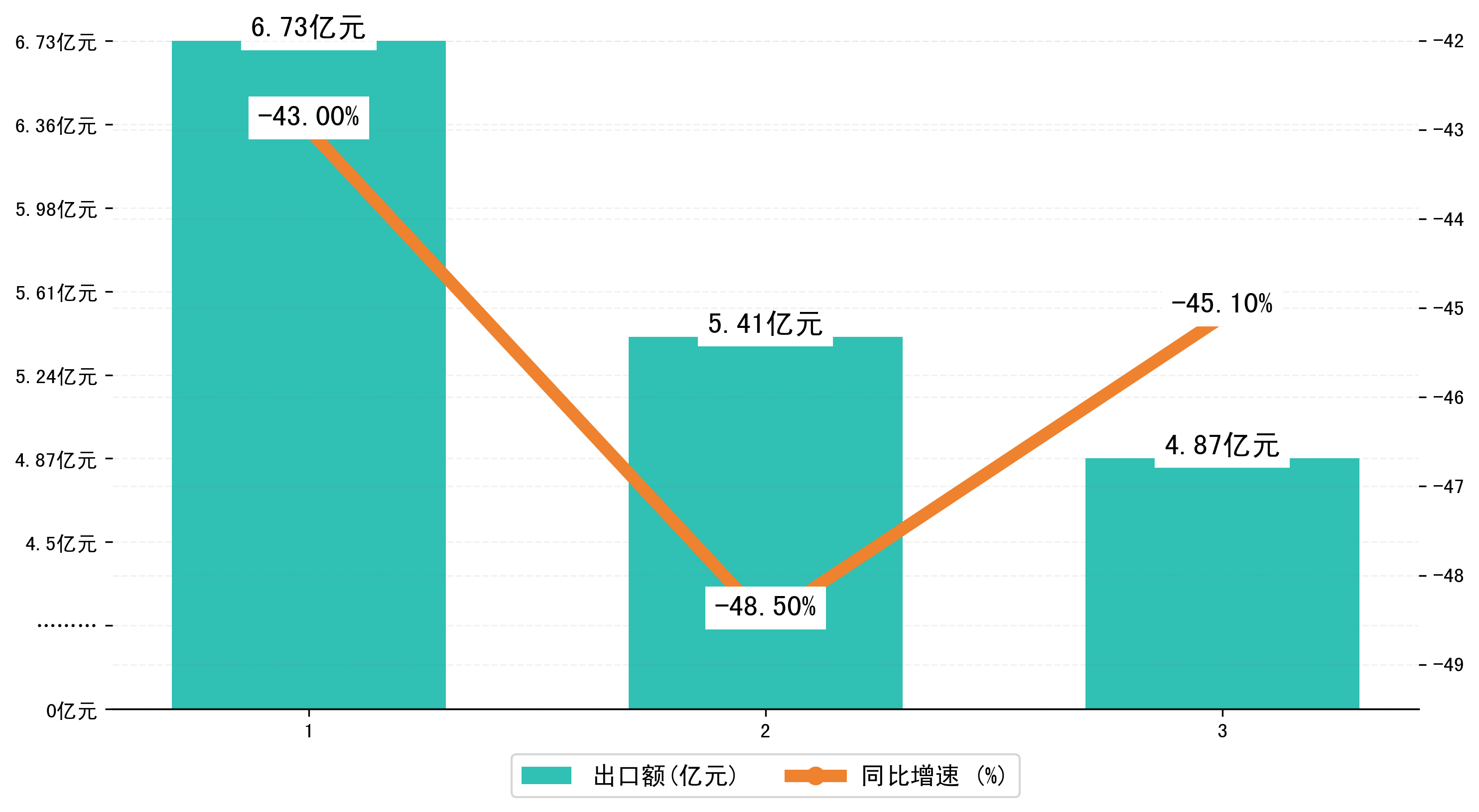 以人民币计,2023年3月乐山市出口额为4,8706.9686万元,相比上月减少了5406.2079万元;相比上年同期减少了2,5514.5565万元,同比减少了-45.10%。