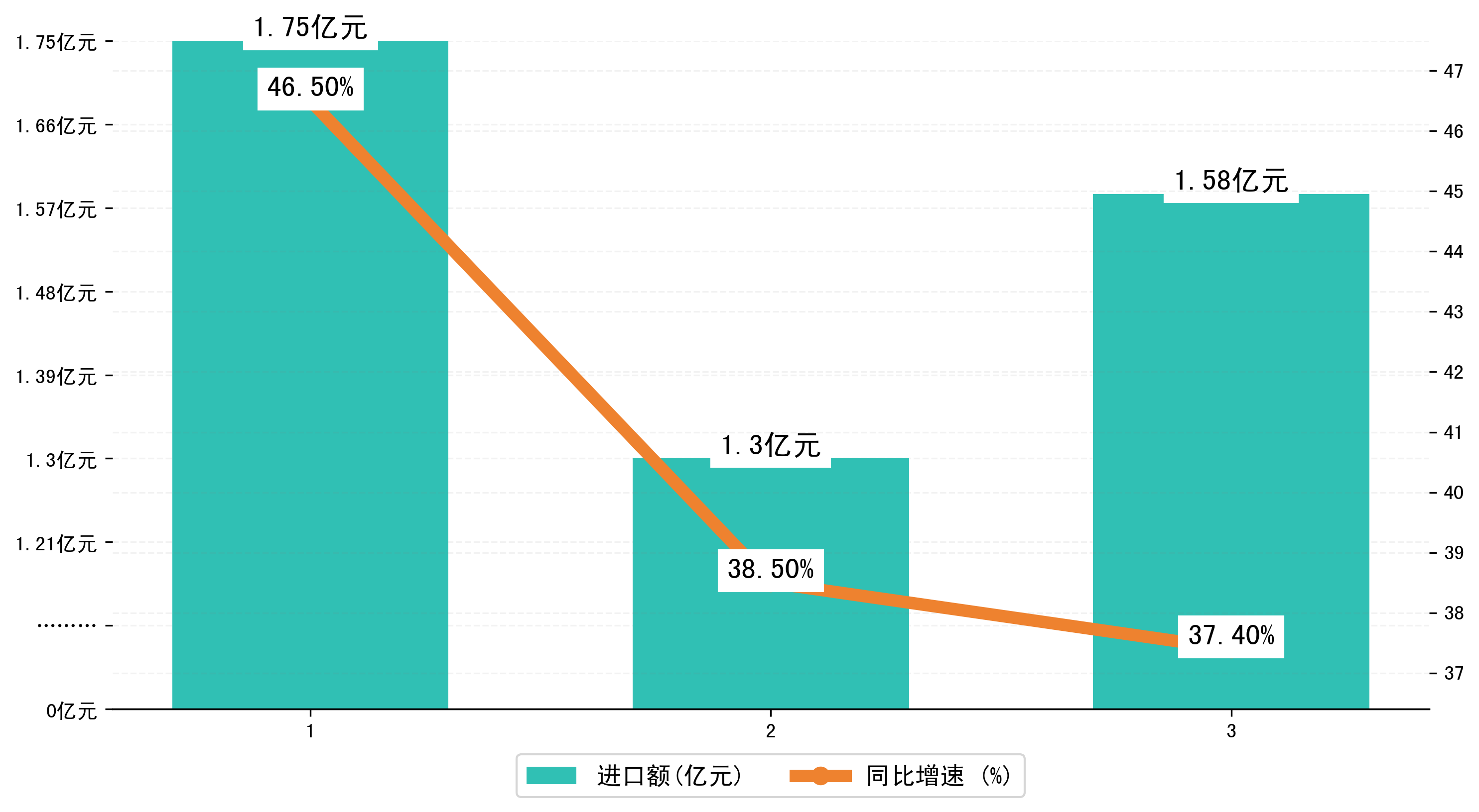以人民币计,2023年1-3月乐山市进口额为4,6422.7653万元,相比上年同期增加了1,2600.5603万元,同比增加了37.40%。