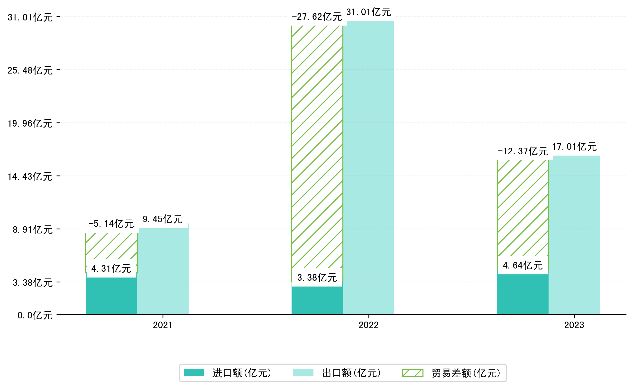 以美元计,2023年1-3月乐山市贸易差额为1,7966,8376万美元(贸易顺差),相比上年同期减少了2,5420,4721万美元,同比减少-58.59%。