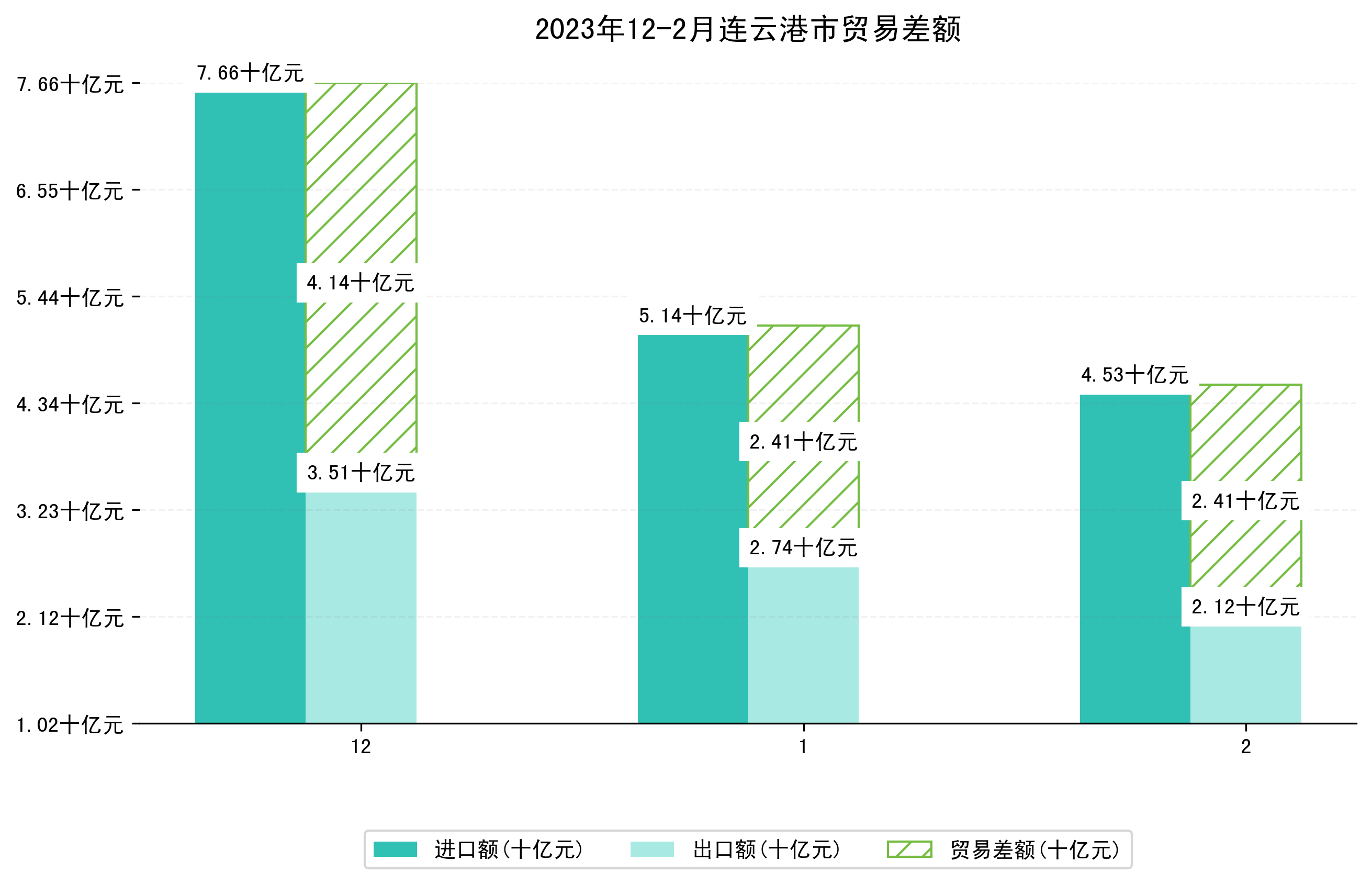 以美元计,2023年1-2月连云港市贸易差额为6,9664,2964万美元(贸易逆差),相比上年同期减少了5,6184,1055万美元,同比减少416.79%。