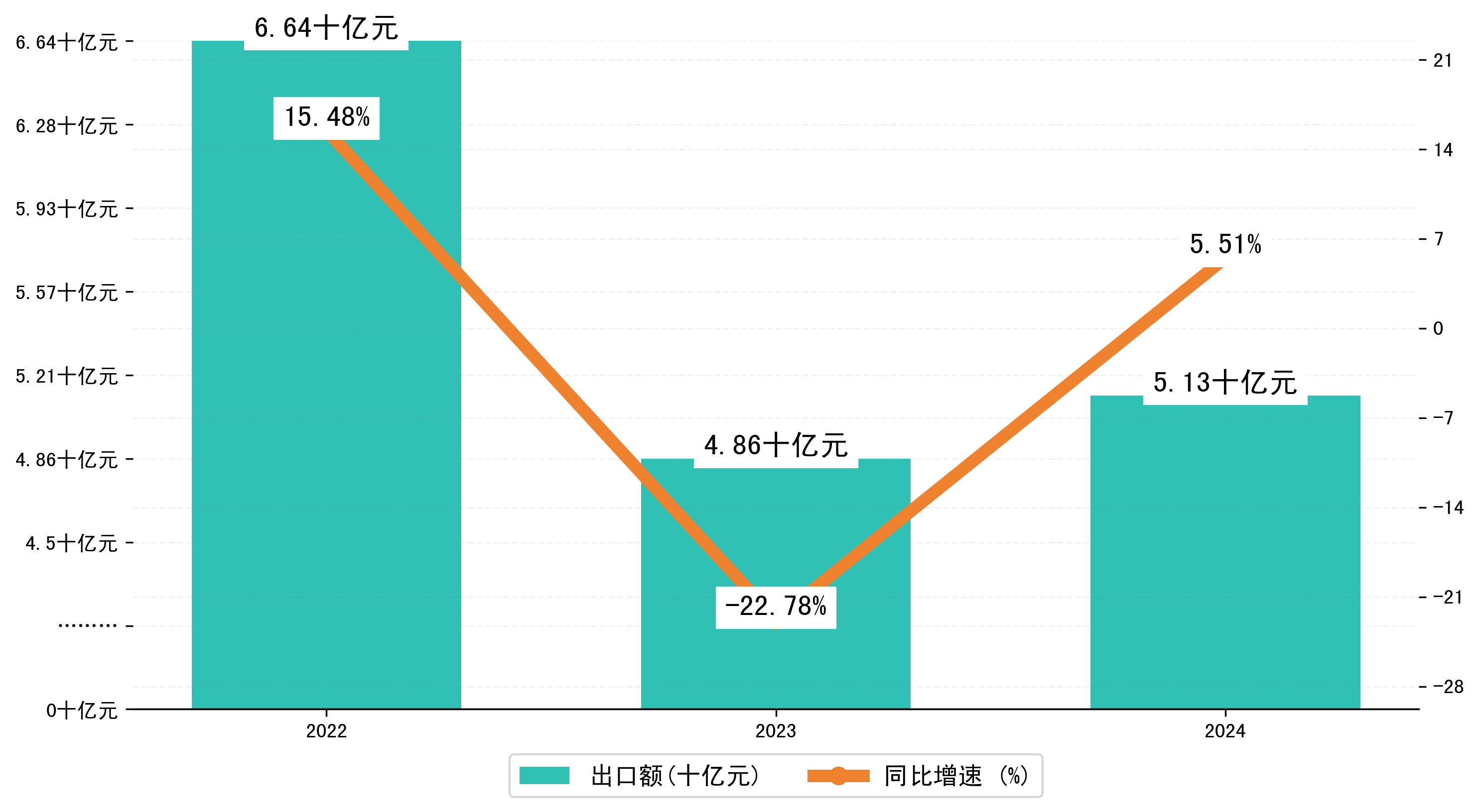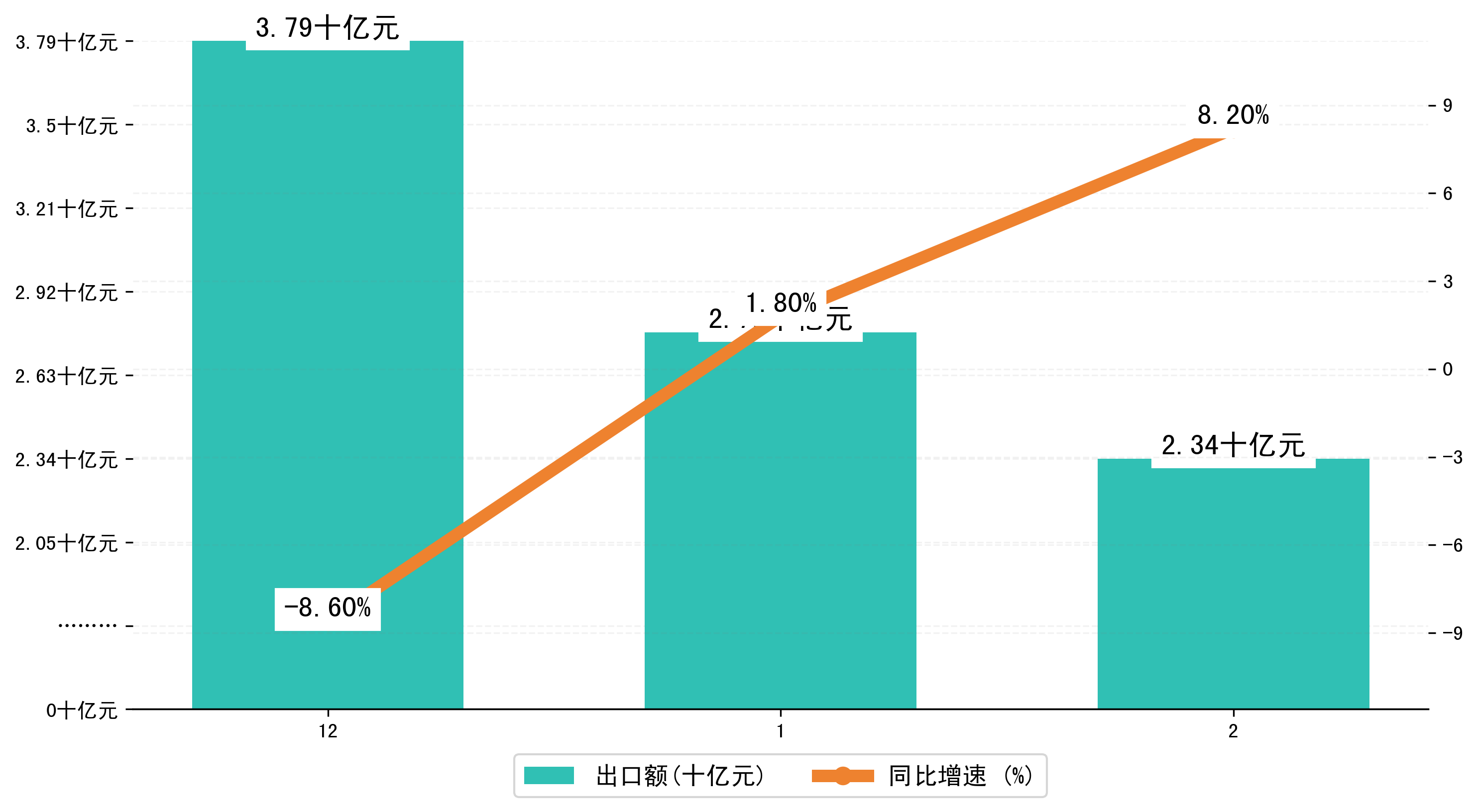 以人民币计,2024年1-2月连云港市出口额为51,2571.334万元,相比上年同期增加了2,6745.7748万元,同比增加了8.20%。