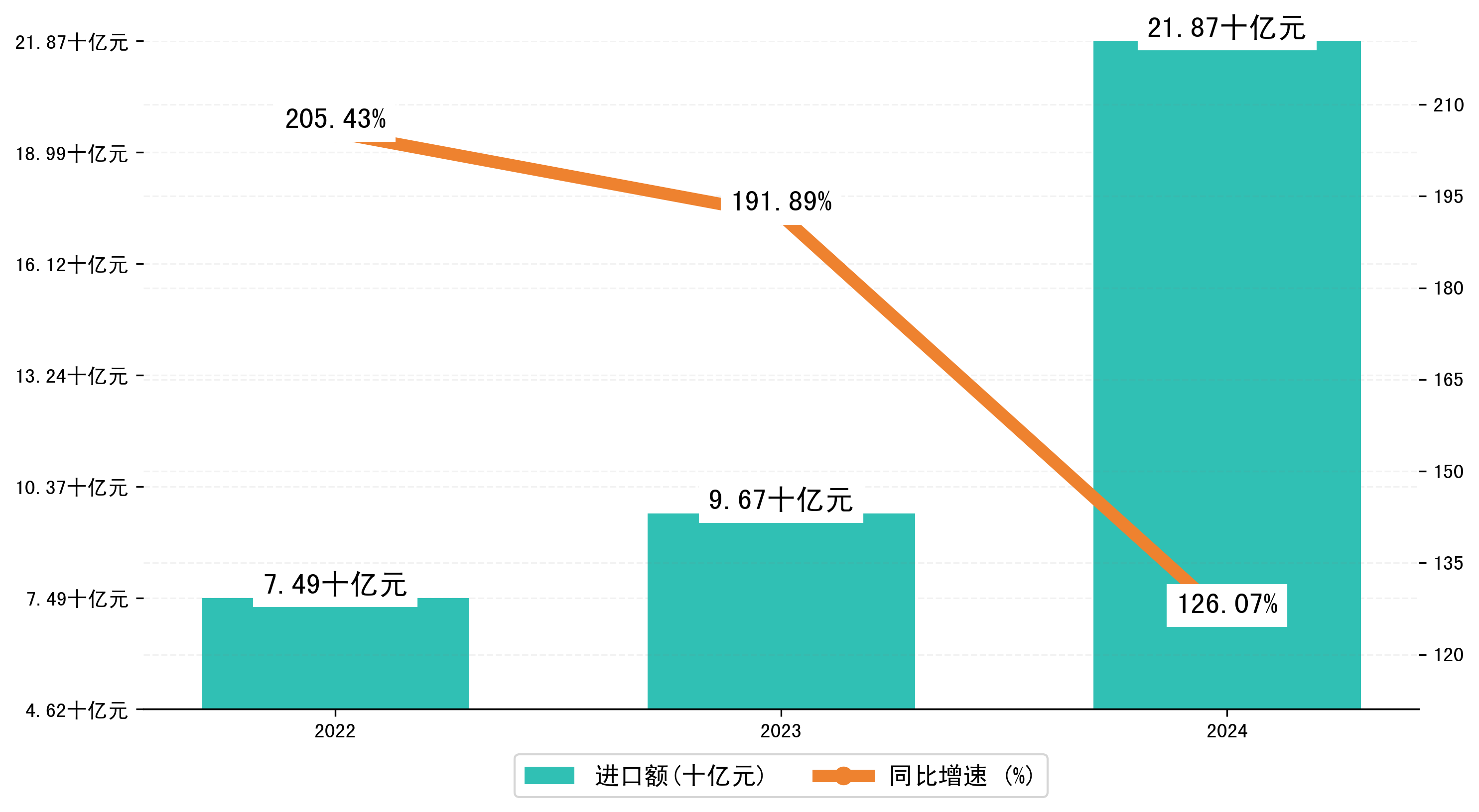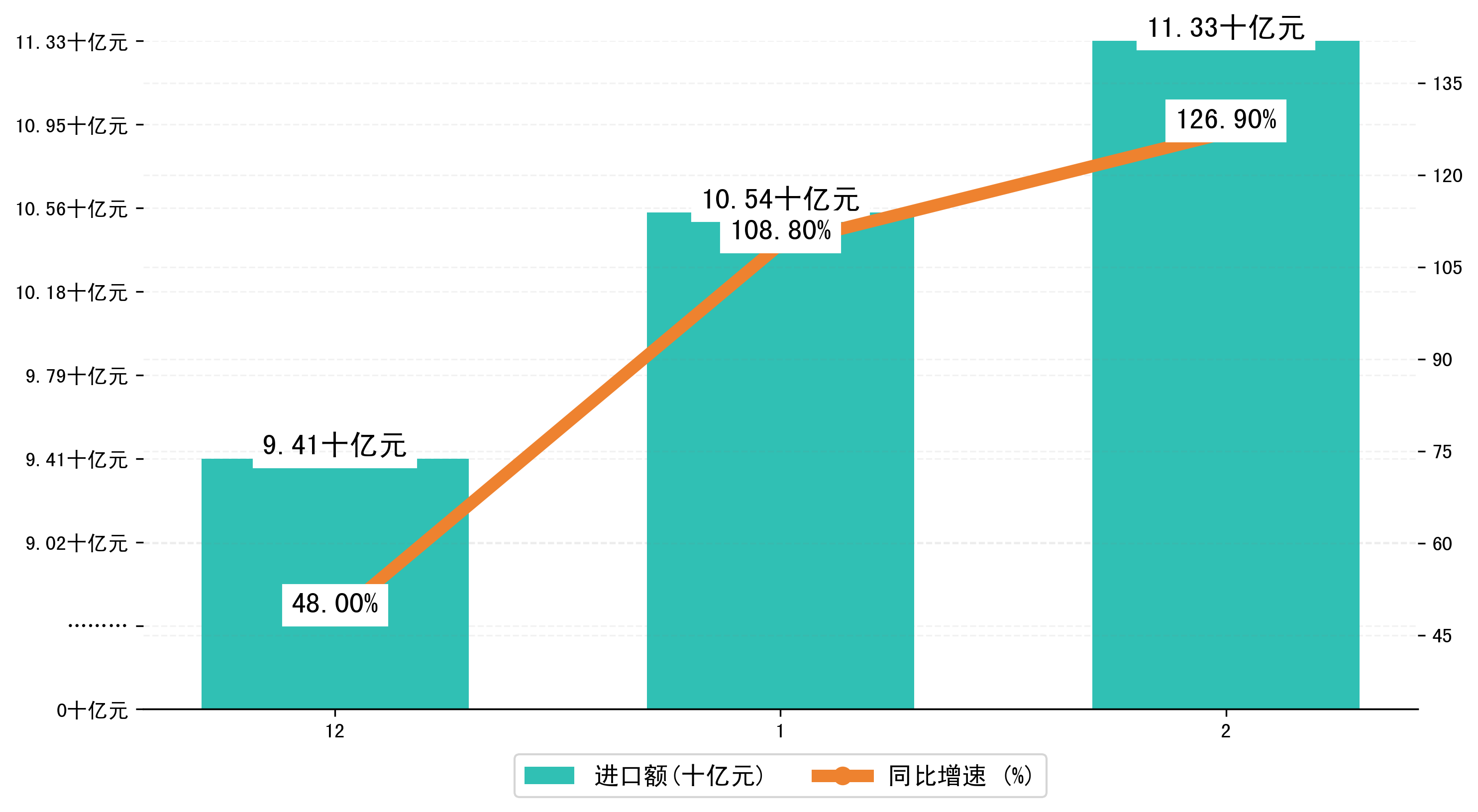 以人民币计,2024年2月连云港市进口额为113,3085.1566万元,相比上月增加了7,9171.4609万元;相比上年同期增加了68,0059.6217万元,同比增加了126.90%。