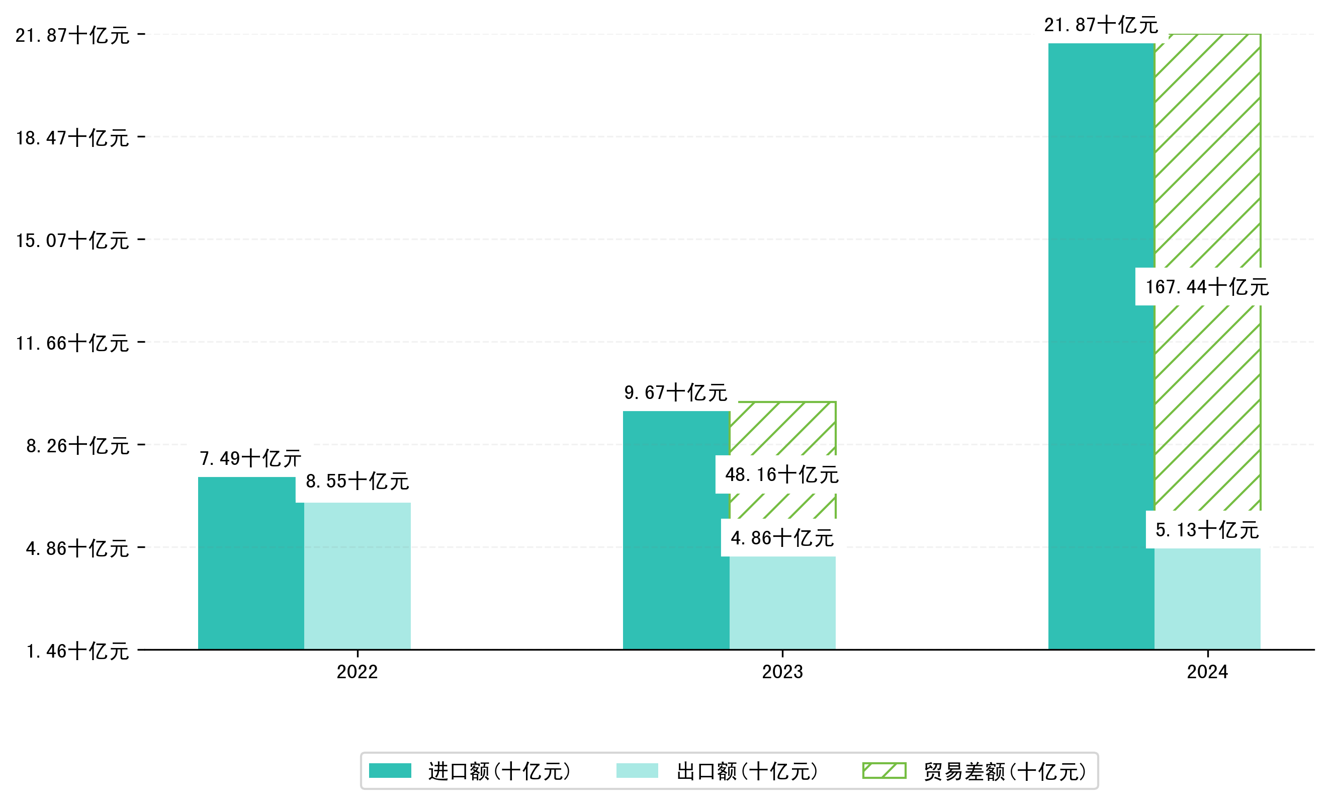 以人民币计,2024年2月连云港市贸易差额为89,8754,1686万元(贸易逆差),相比上月减少了12,3080,8189万元,即1,7480,9545万美元;相比上年同期减少了65,7978,0380万元,同比减少273.27%。