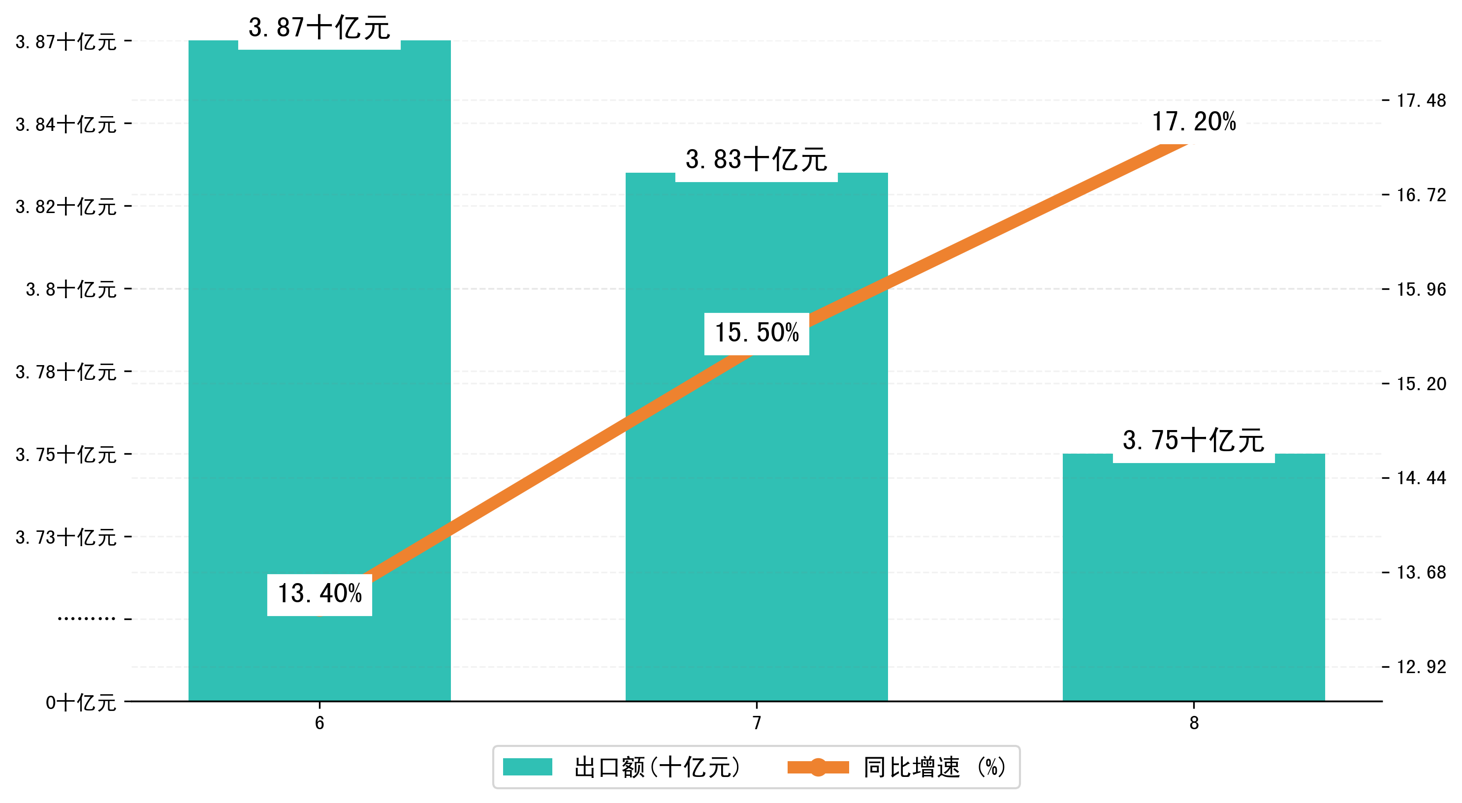 以美元计,2024年1-8月连云港市出口额为37,3663.0535万美元,相比上年同期增加了4,7184.5625万美元,同比增加14.70%。