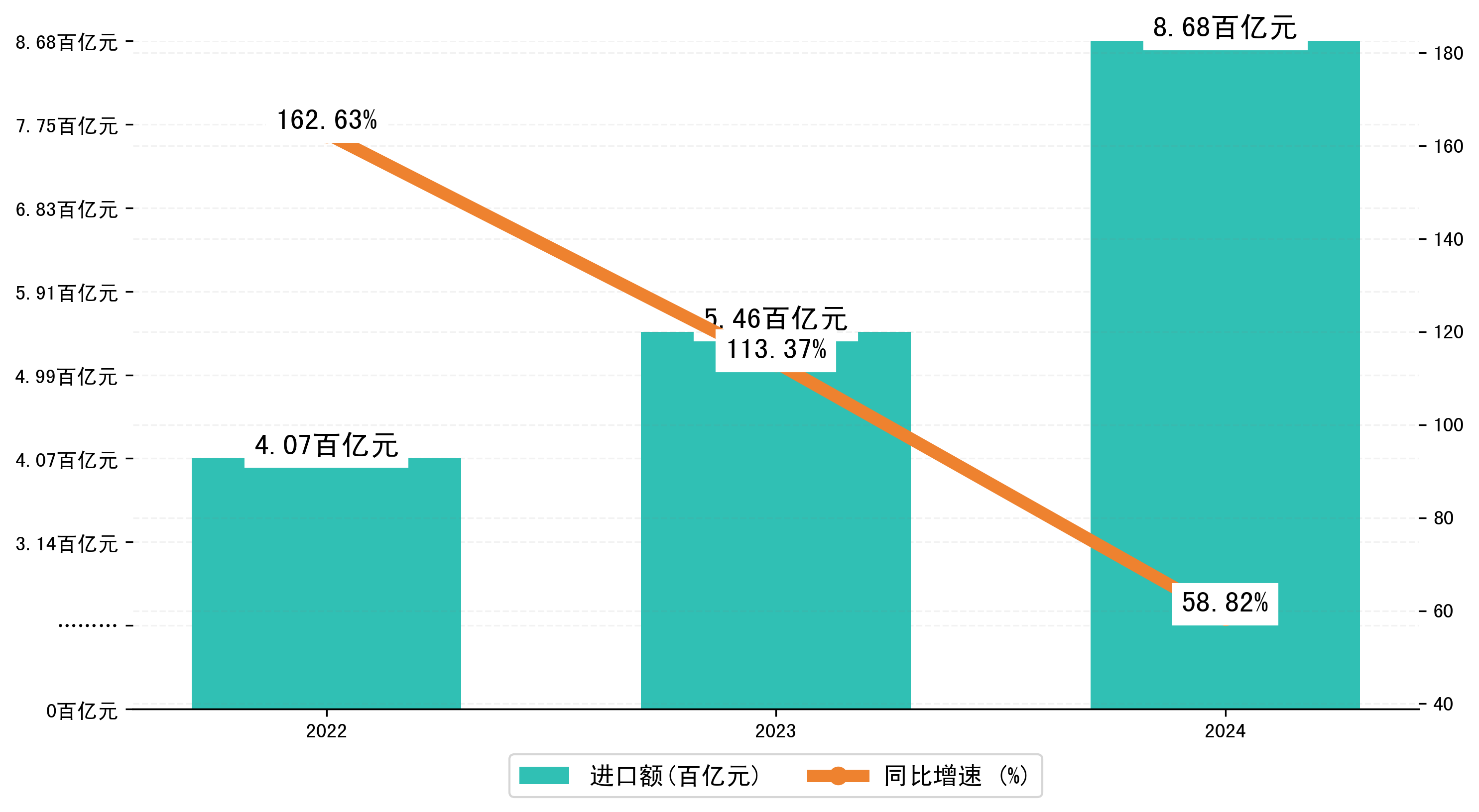 以人民币计,2024年1-8月连云港市进口额为867,5830.9683万元,相比上年同期增加了321,3131.583万元,同比增加了58.30%。