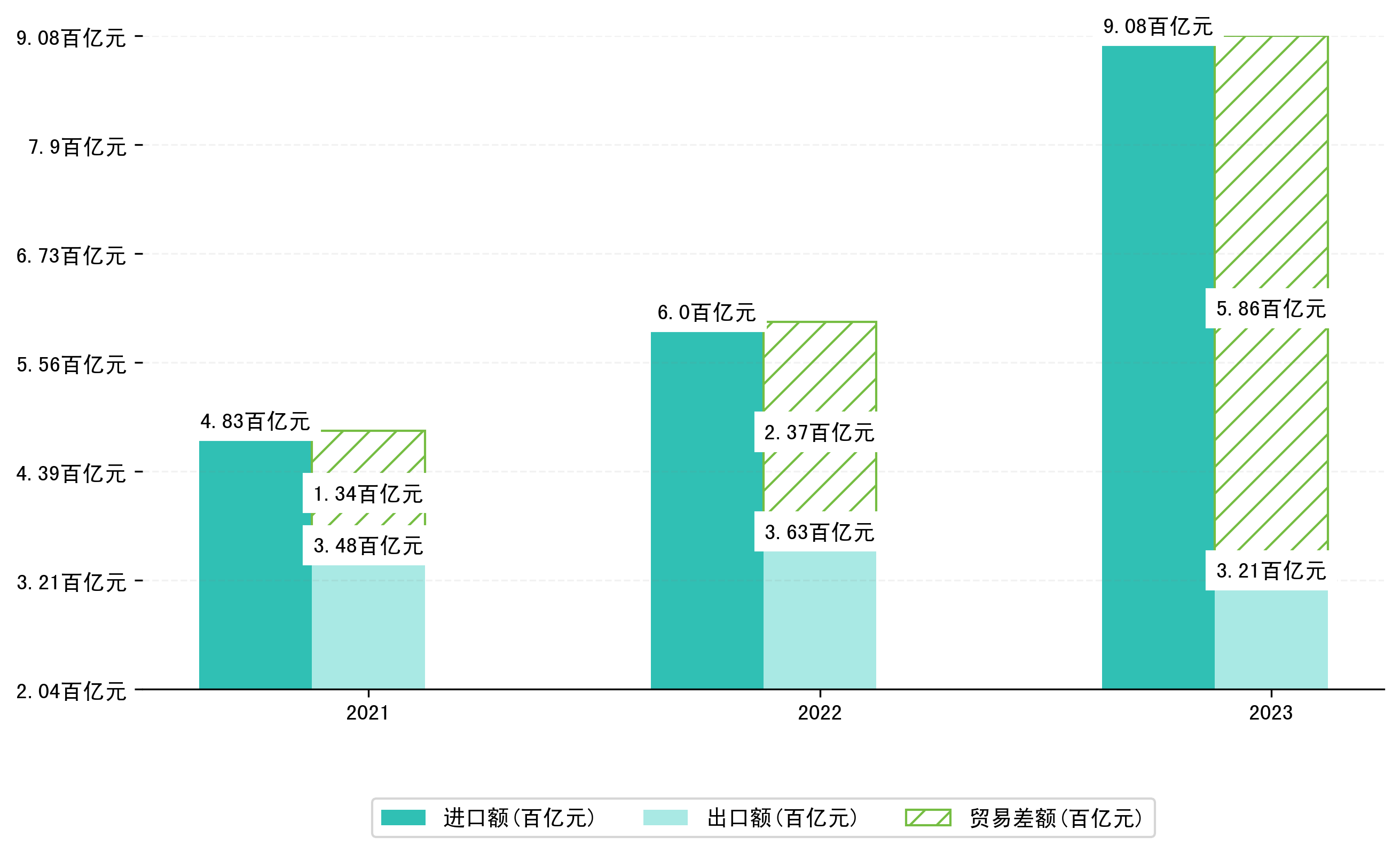 以人民币计,2023年11月连云港市贸易差额为92,0506,7965万元(贸易逆差),相比上月减少了2,3286,1306万元,即3208,2355万美元;相比上年同期减少了47,5832,3712万元,同比减少107.01%。