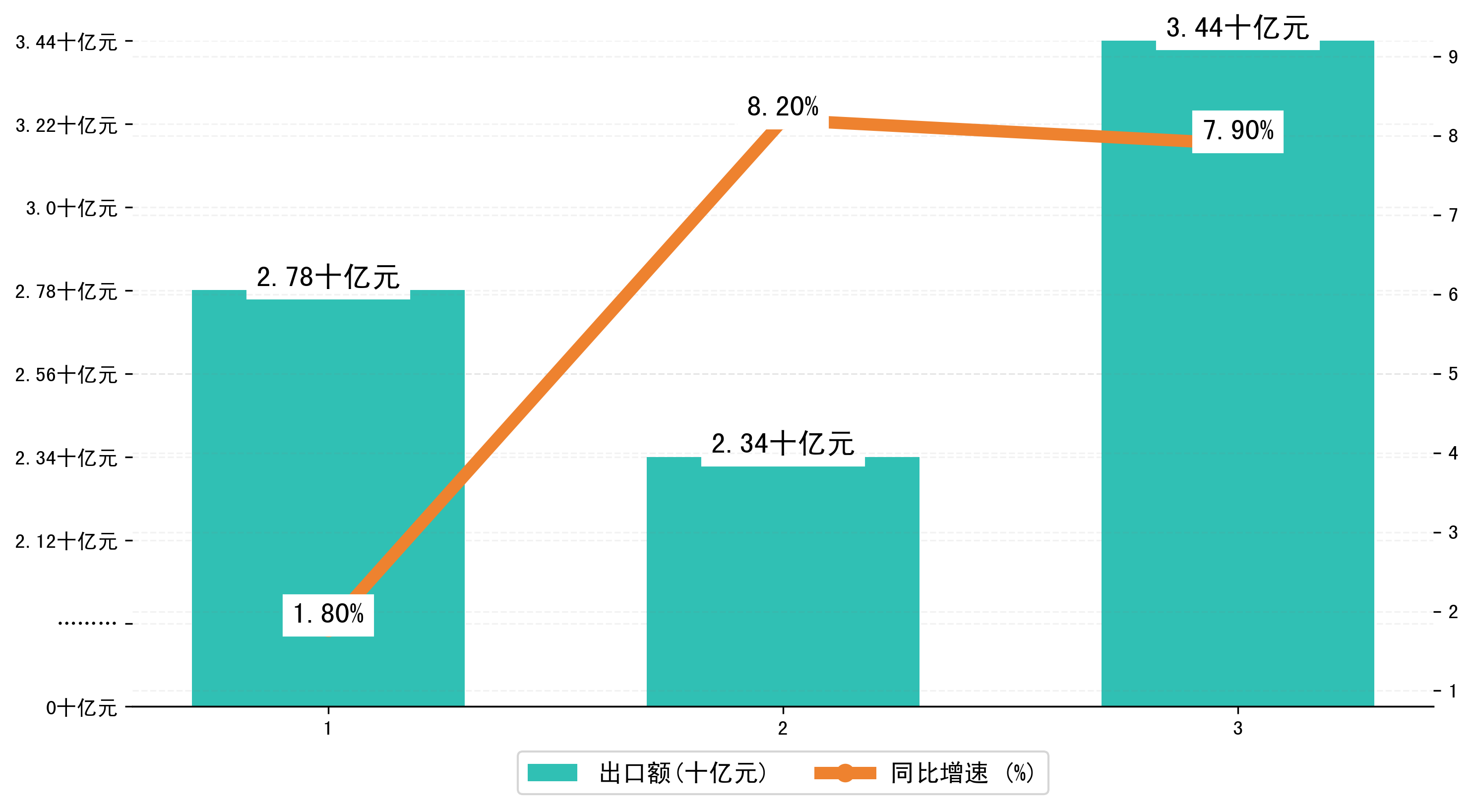 以人民币计,2024年1-3月连云港市出口额为85,5749.4619万元,相比上年同期增加了2,3253.0795万元,同比增加了7.90%。