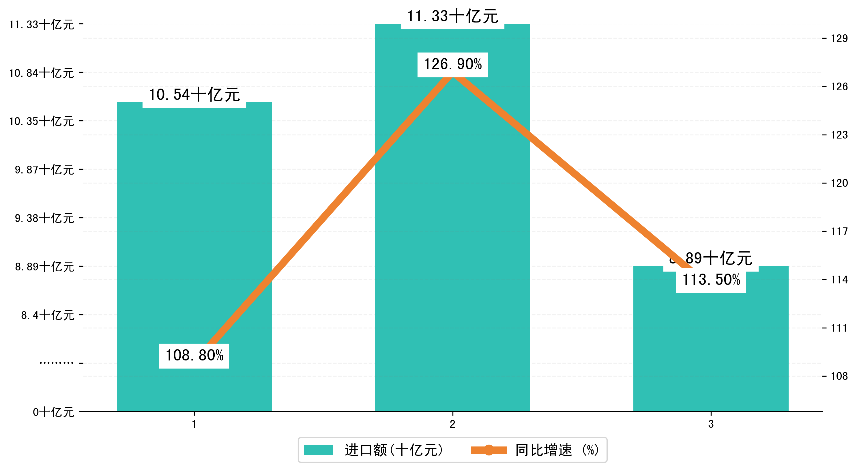 以人民币计,2024年3月连云港市进口额为88,8805.4275万元,相比上月减少了24,4279.7291万元;相比上年同期增加了38,1816.2878万元,同比增加了113.50%。