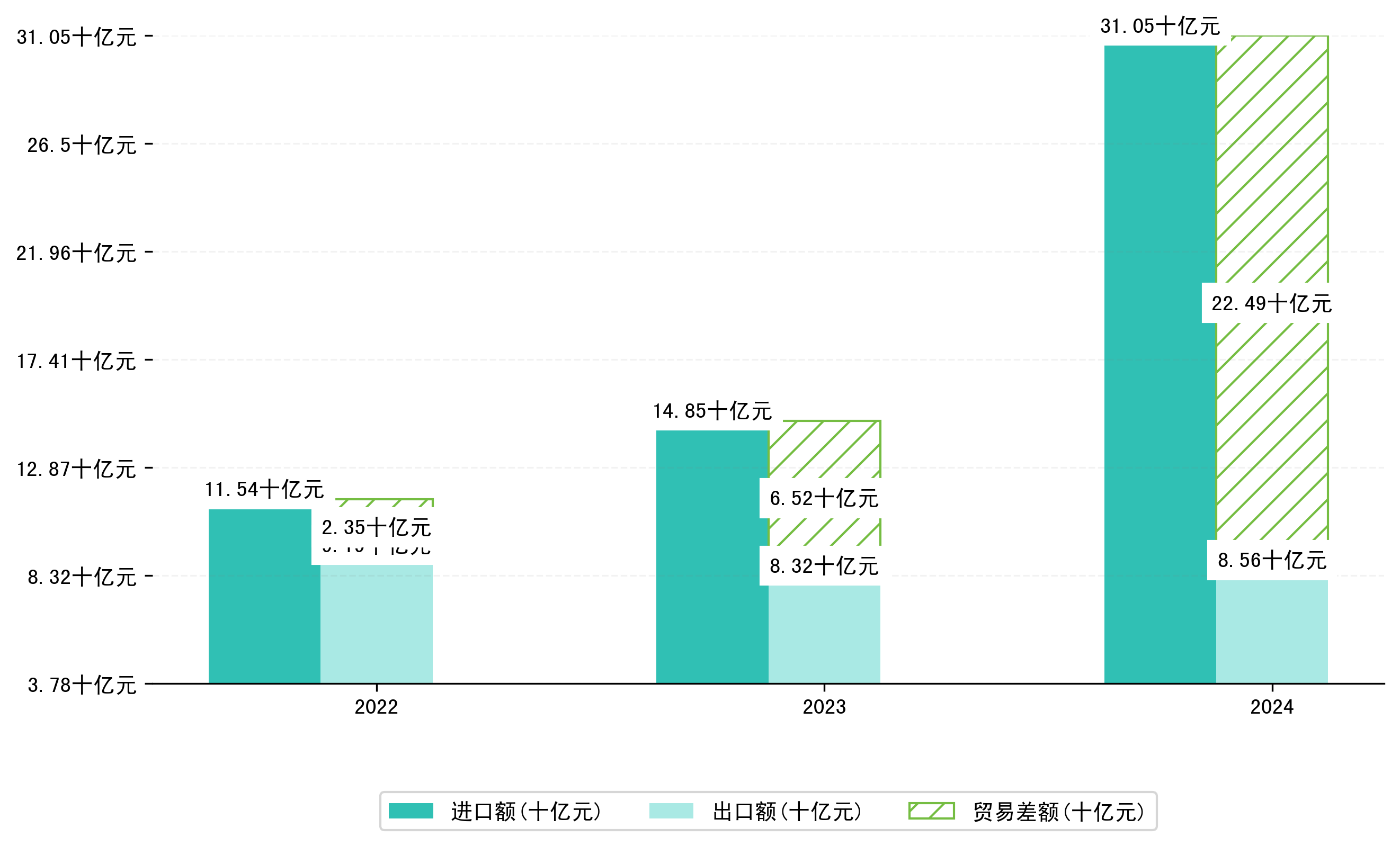 以人民币计,2024年3月连云港市贸易差额为54,4971,0818万元(贸易逆差),相比上月增加了35,3783,0868万元,即4,9814,8577万美元;相比上年同期减少了38,4676,8280万元,同比减少239.98%。