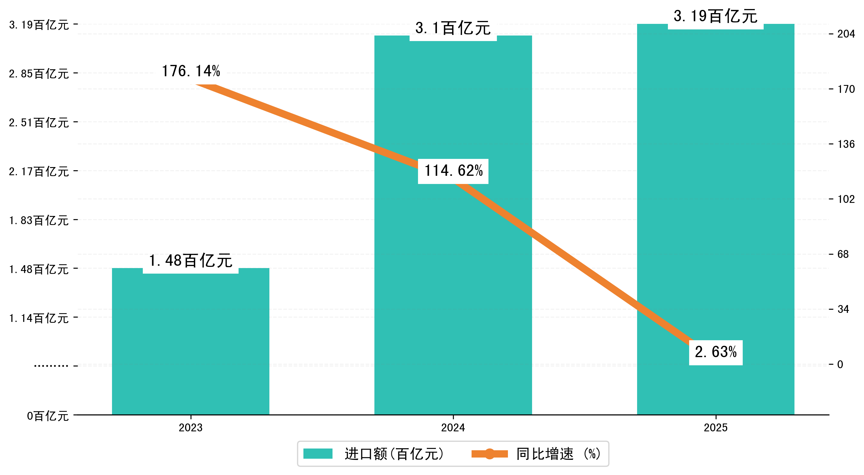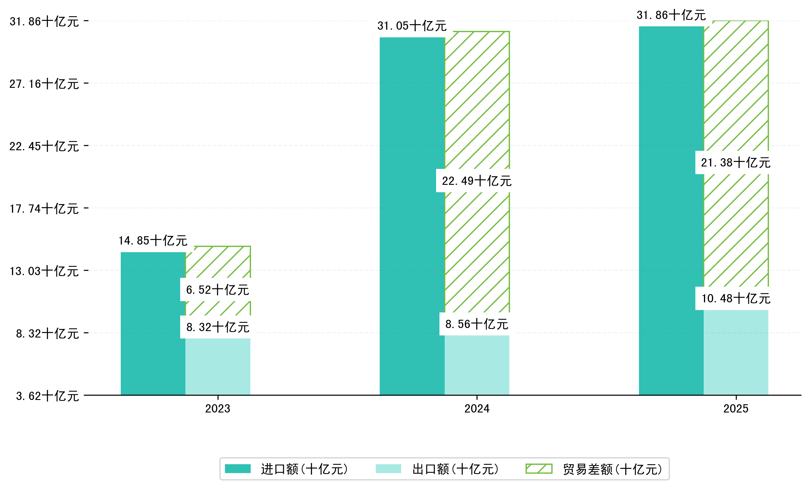 以人民币计,2025年1-3月连云港市进口额为318,6350.5798万元,相比上年同期增加了8,1624.2886万元,同比增加了2.30%。