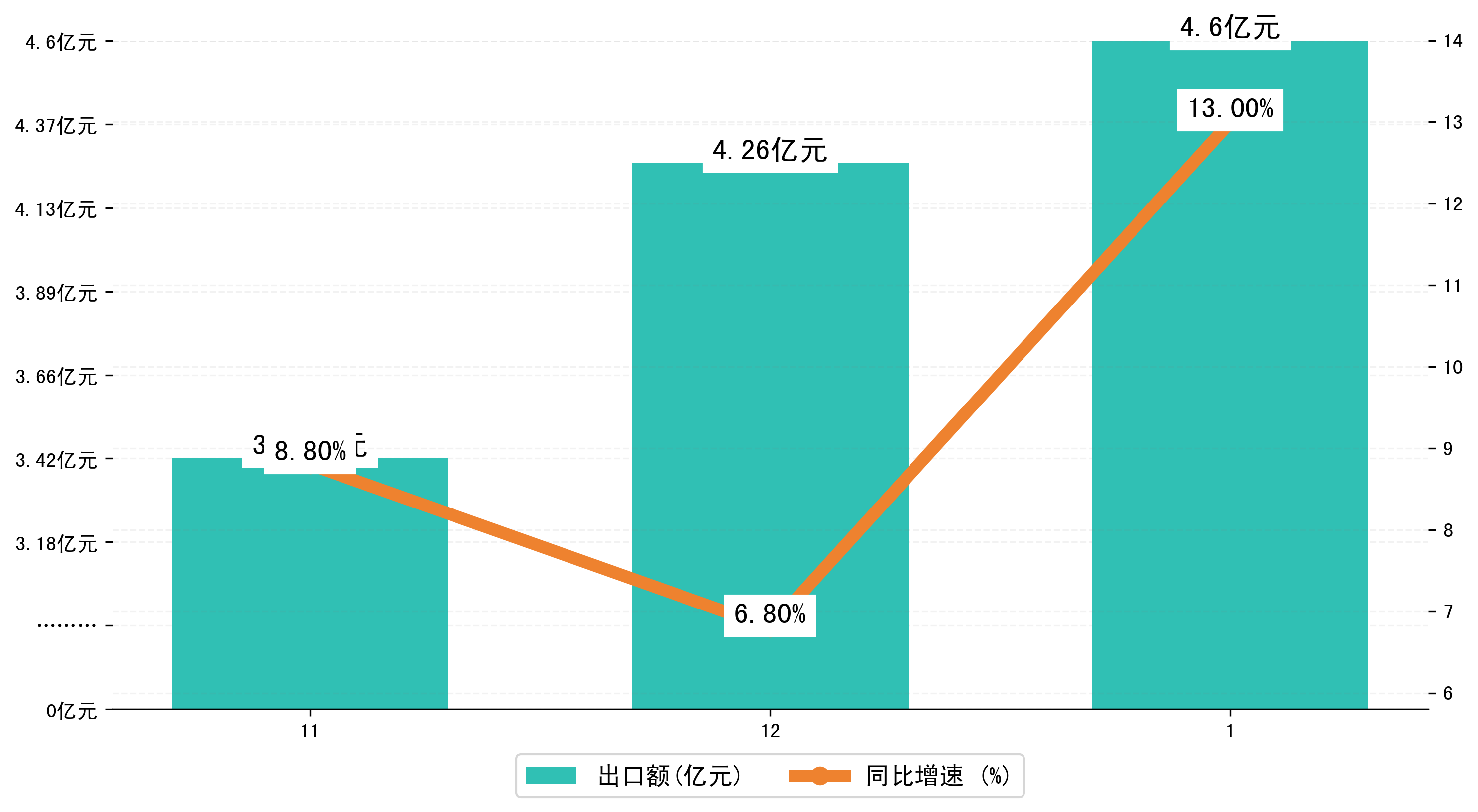 以人民币计,2023年1-1月铜陵市出口额为4,6036.1631万元,相比上年同期增加了5289.7749万元,同比增加了13.00%。