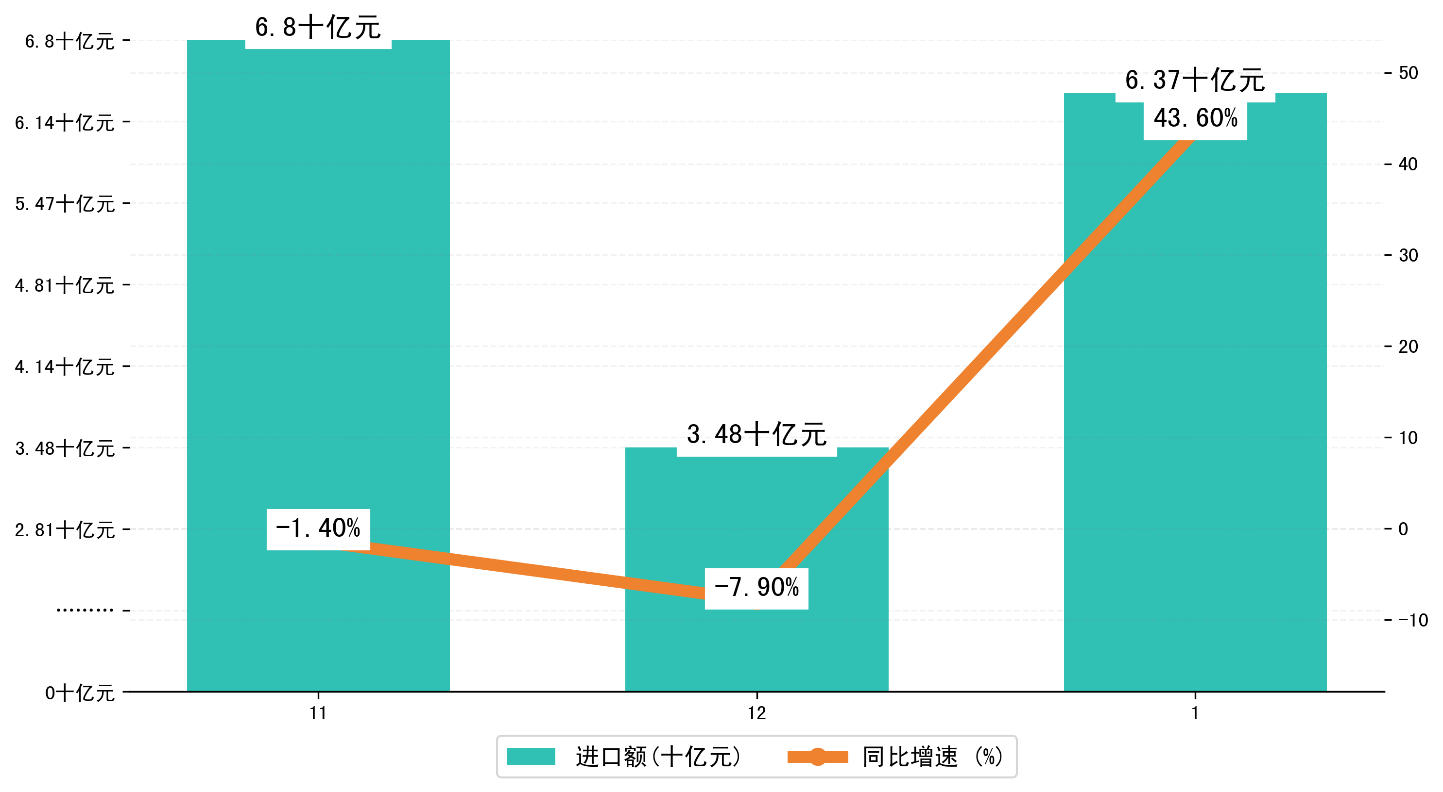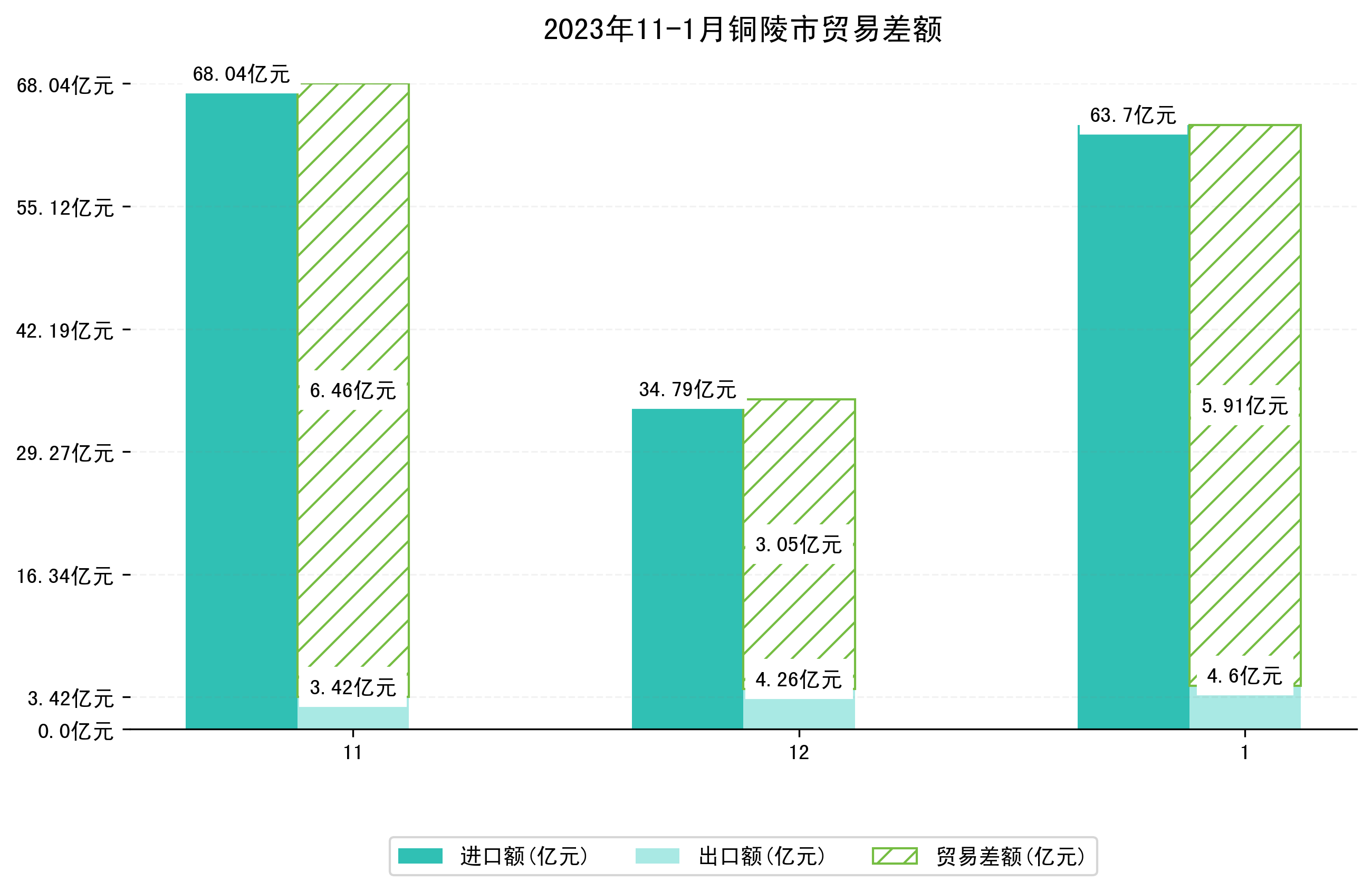 以人民币计,2023年1-1月铜陵市进口额为63,7000.4841万元,相比上年同期增加了19,8694.833万元,同比增加了43.60%。