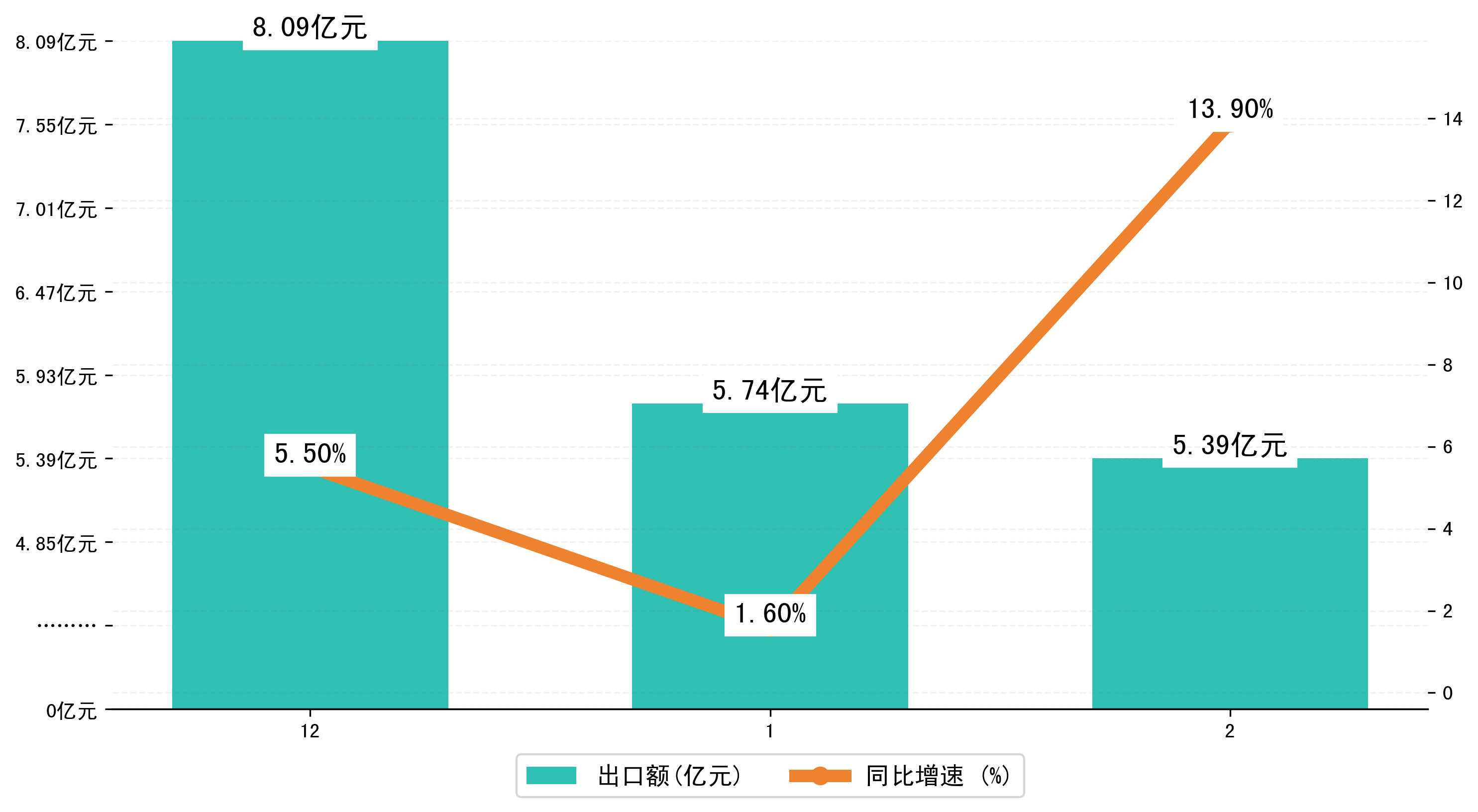 以人民币计,2023年1-2月六安市出口额为11,1320.8217万元,相比上年同期增加了1,3439.0882万元,同比增加了13.90%。