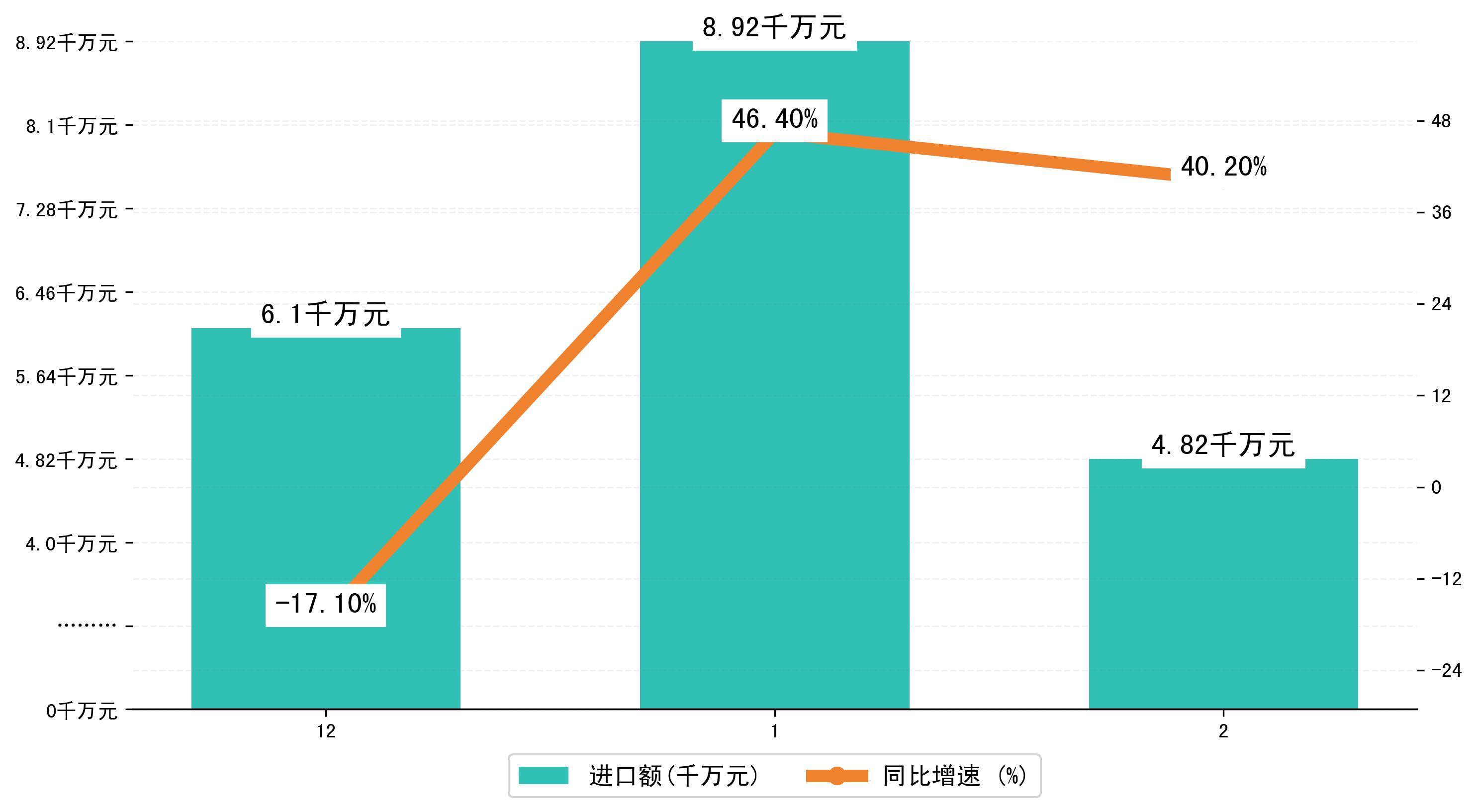 以人民币计,2023年1-2月六安市进口额为1,3740.1513万元,相比上年同期增加了3942.5683万元,同比增加了40.20%。